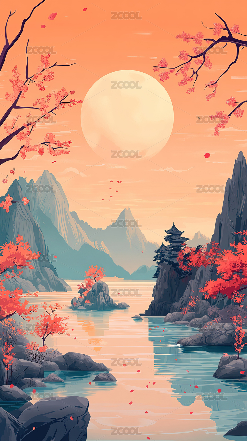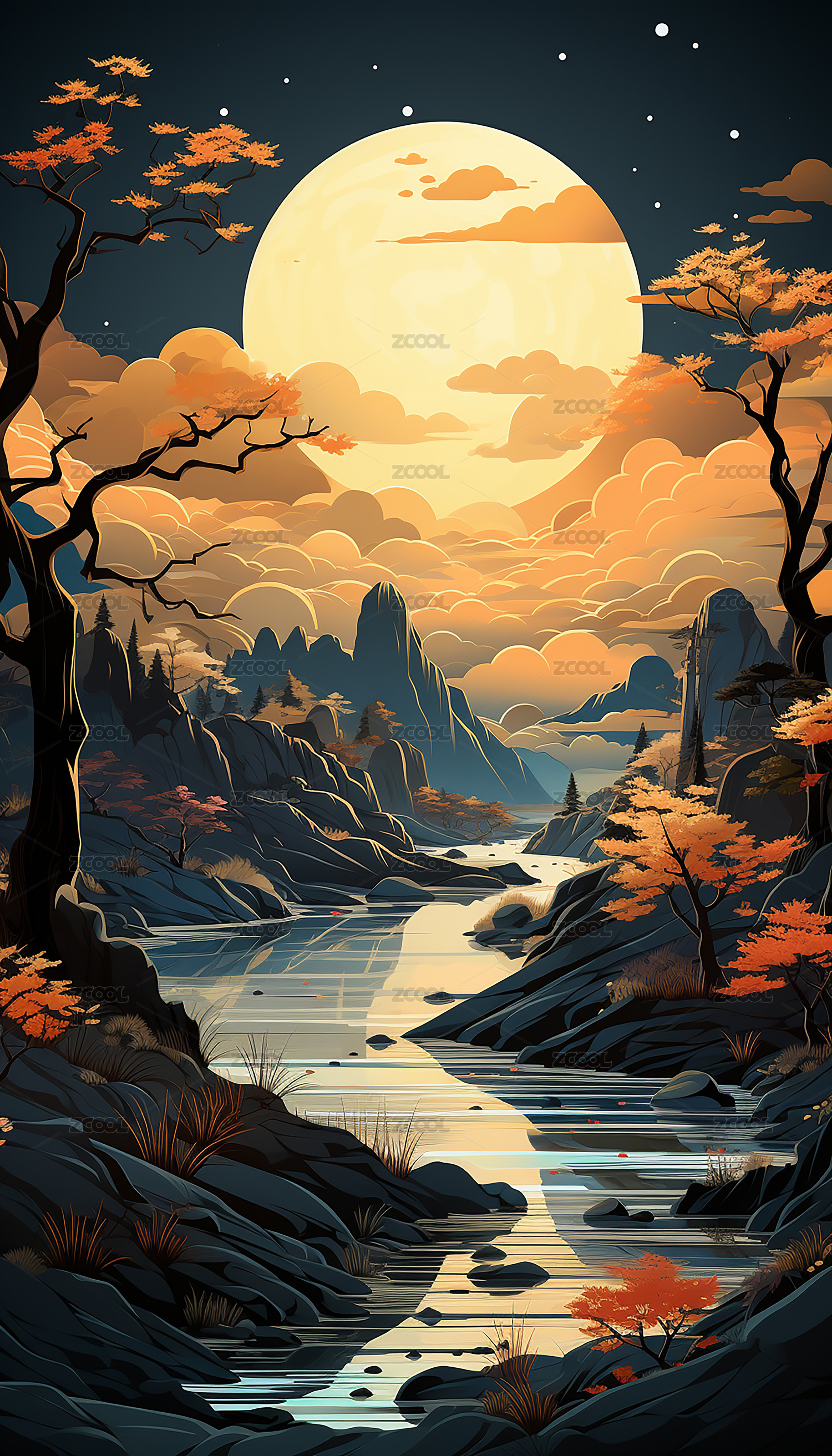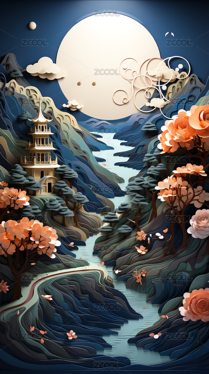 剪纸风格,中秋节,月圆山水风景,剪纸艺术,剪纸插画