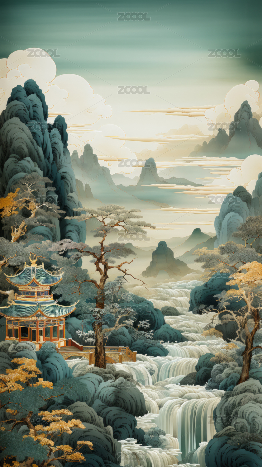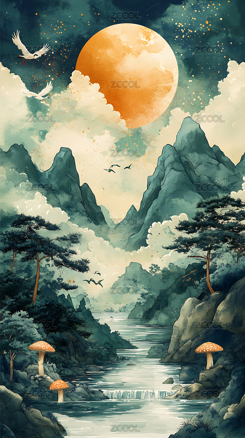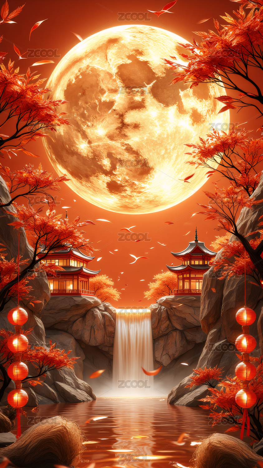 剪纸风格,中秋节,月圆山水风景,剪纸艺术,剪纸插画