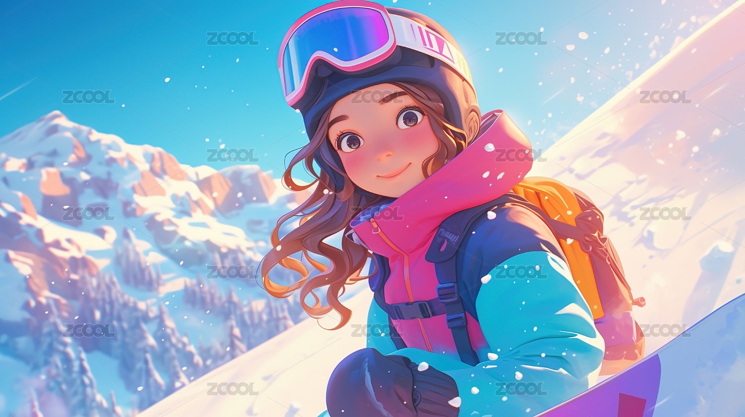 冬天节气大雪卡通3D女孩滑雪插画