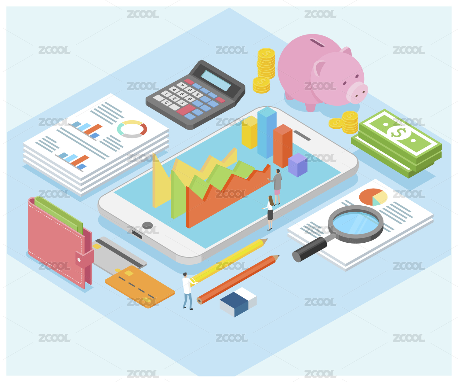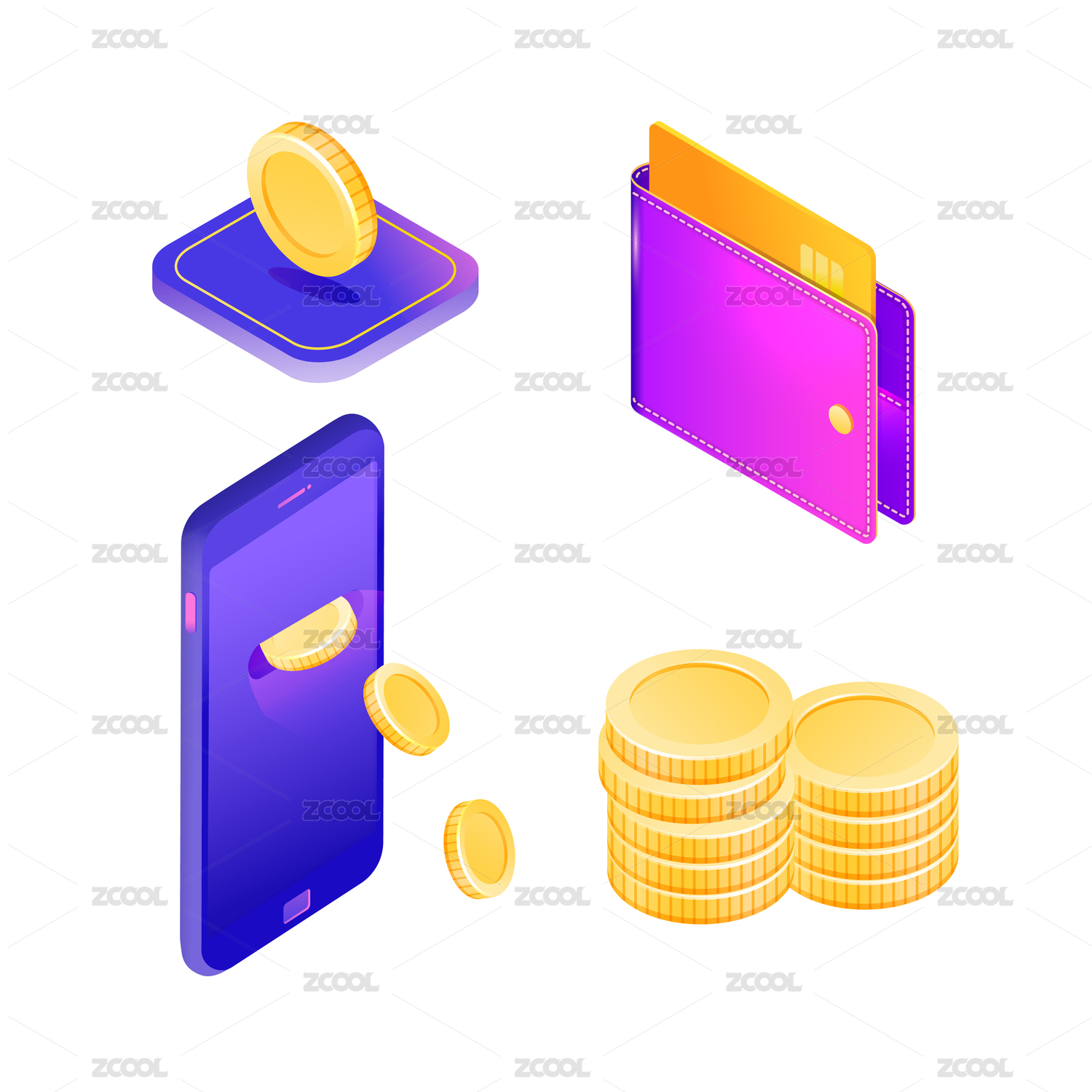 2.5D等距比特币互联网金融概念渐变矢量背景插画