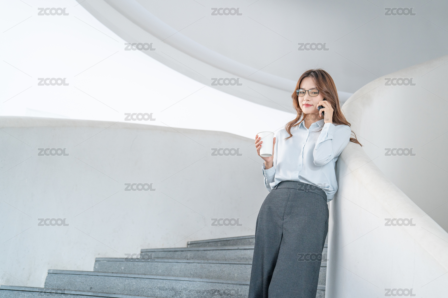 年轻亚洲商务人士在纯色背景墙前用手机打电话