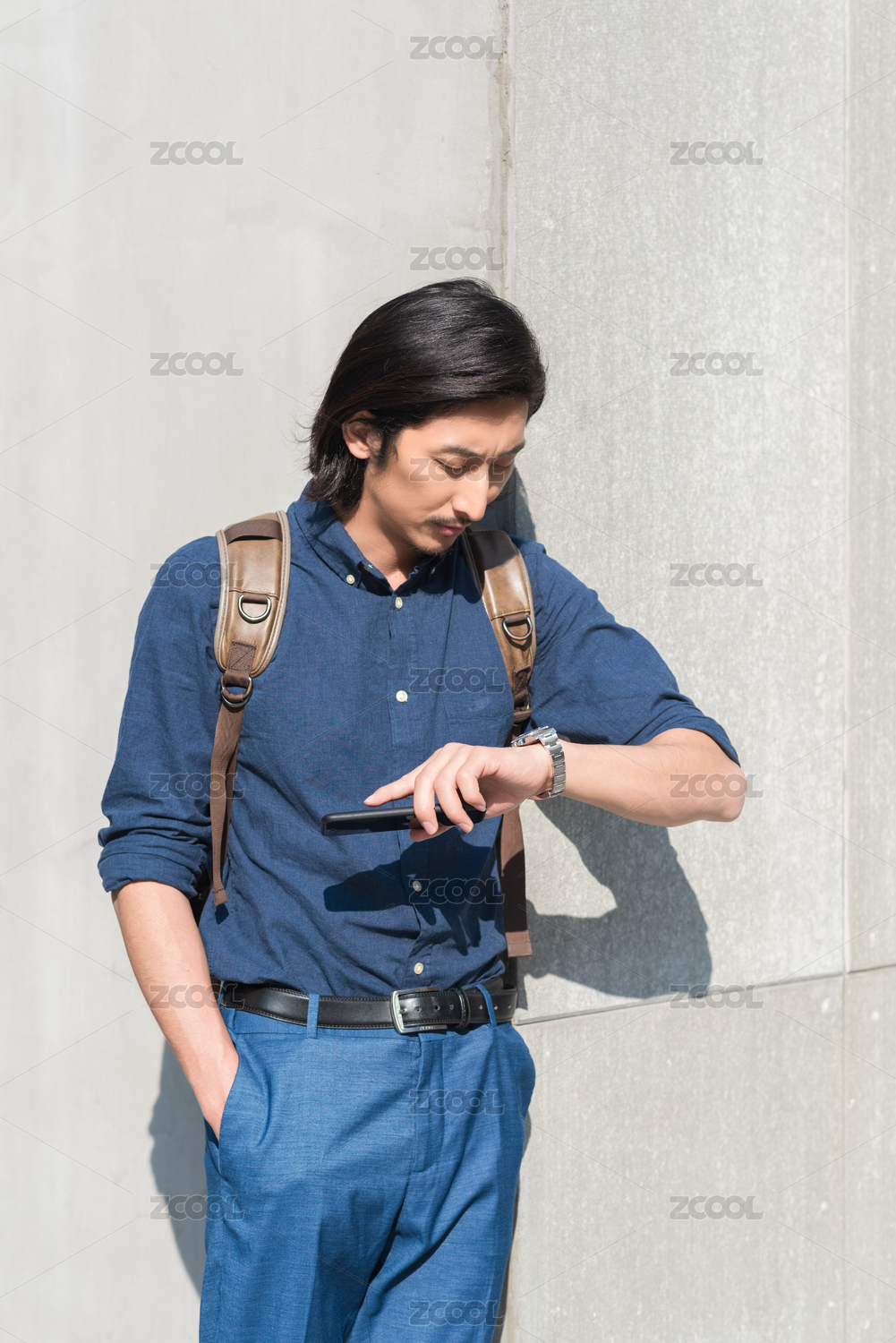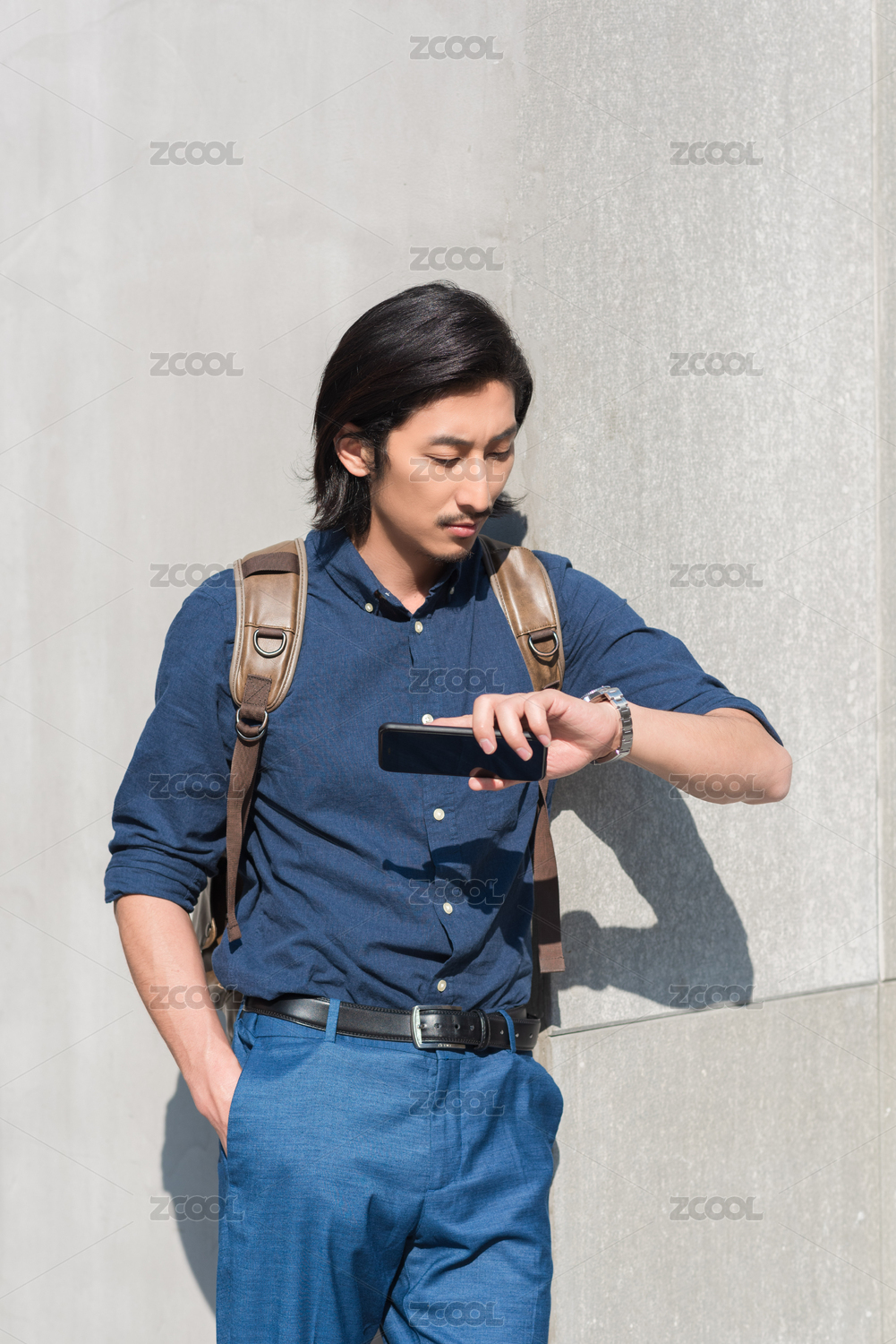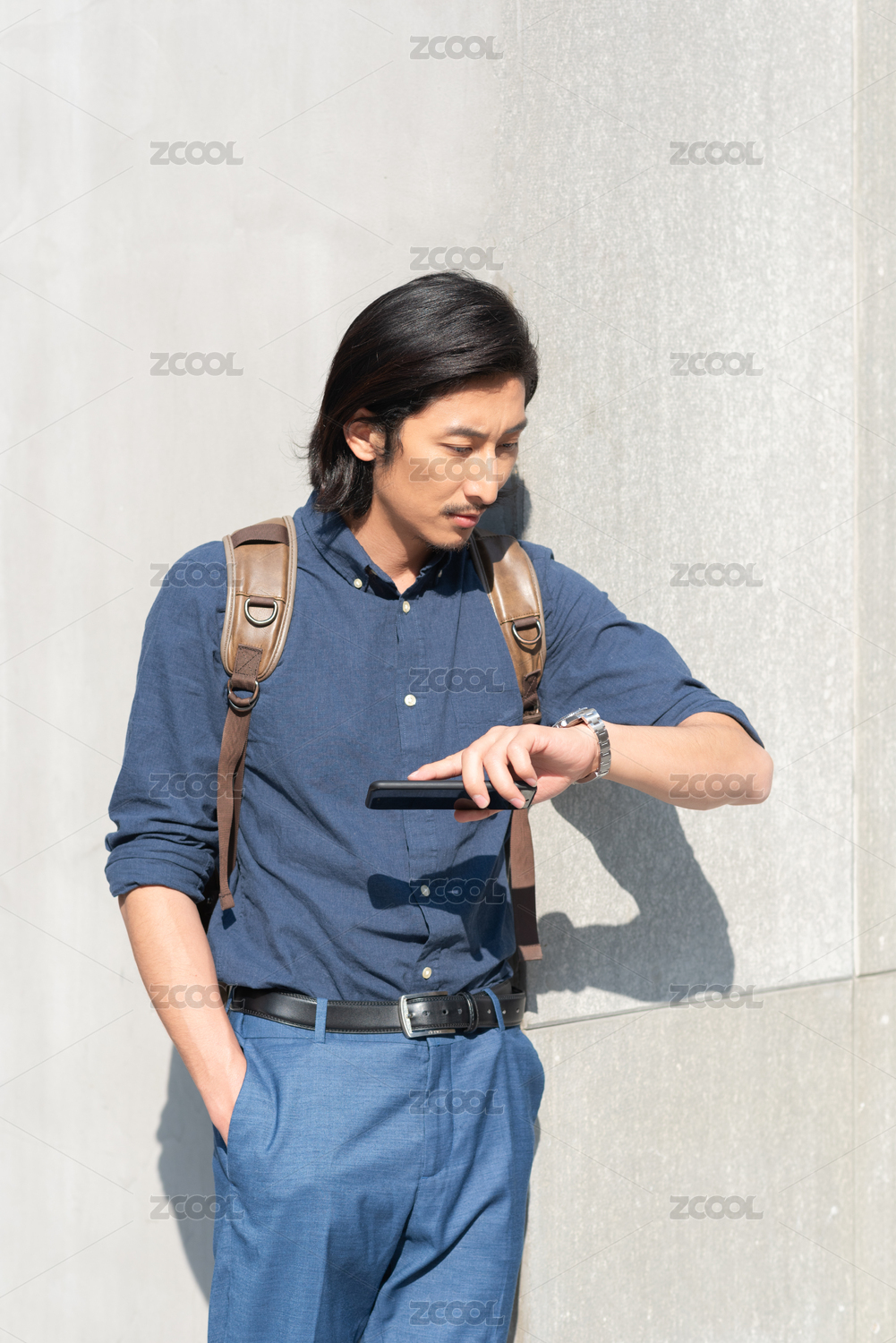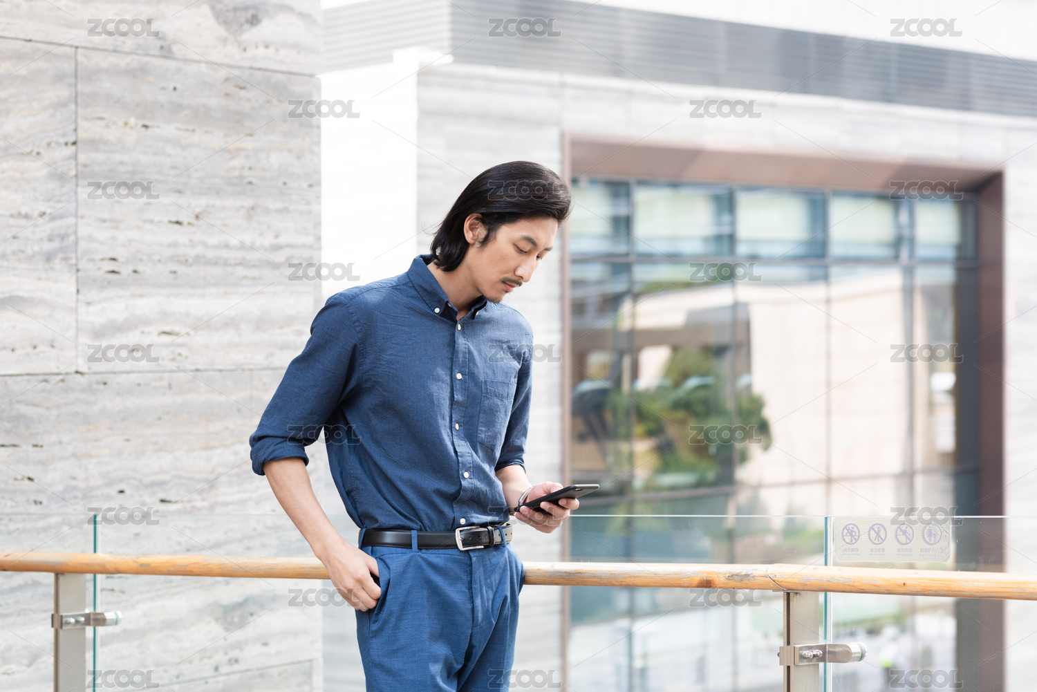 亚裔商务男士在写字楼玻璃窗旁使用手机