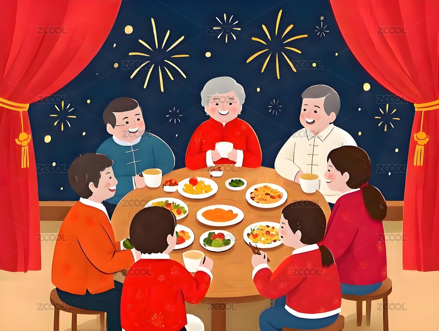 除夕夜一家人围坐在桌子前吃年夜饭拜年插画
