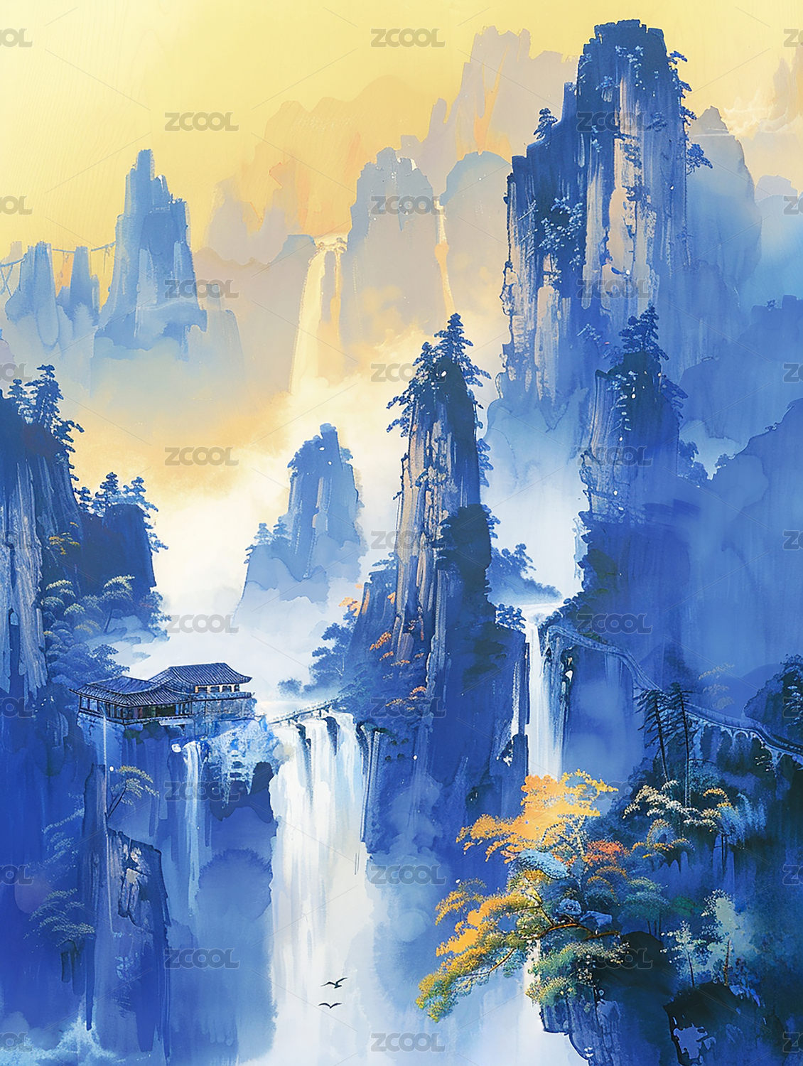 风景,自然,无人,AI数字艺术,户外,瀑布,中国文化,自然美,中国画,高山