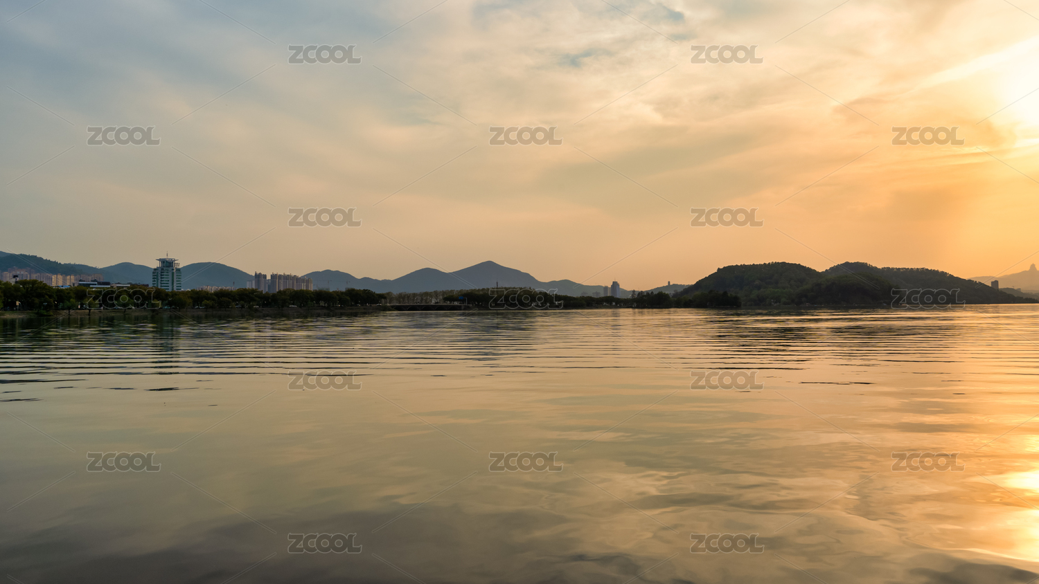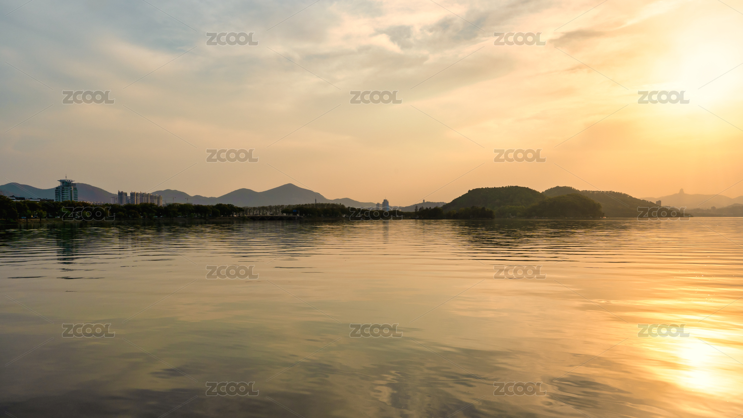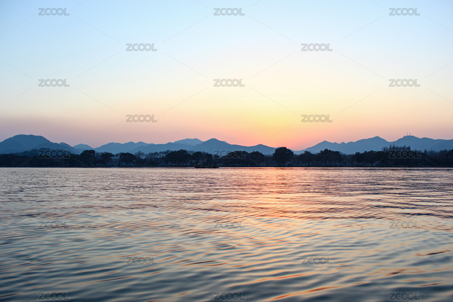 浙江省杭州市一公园附近西湖湖滨日落风光