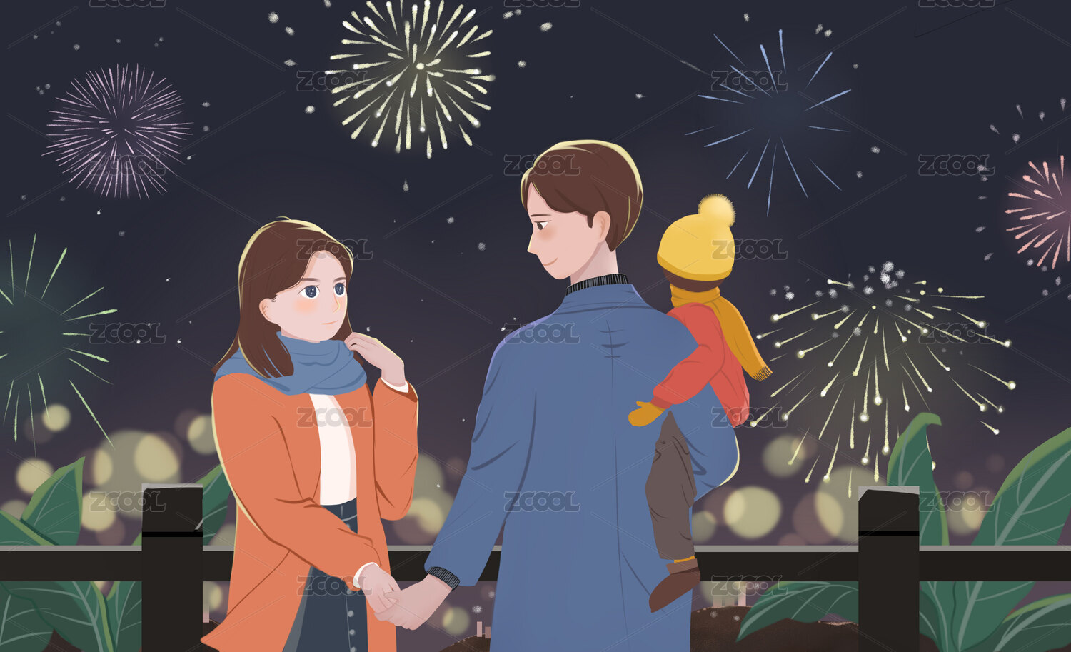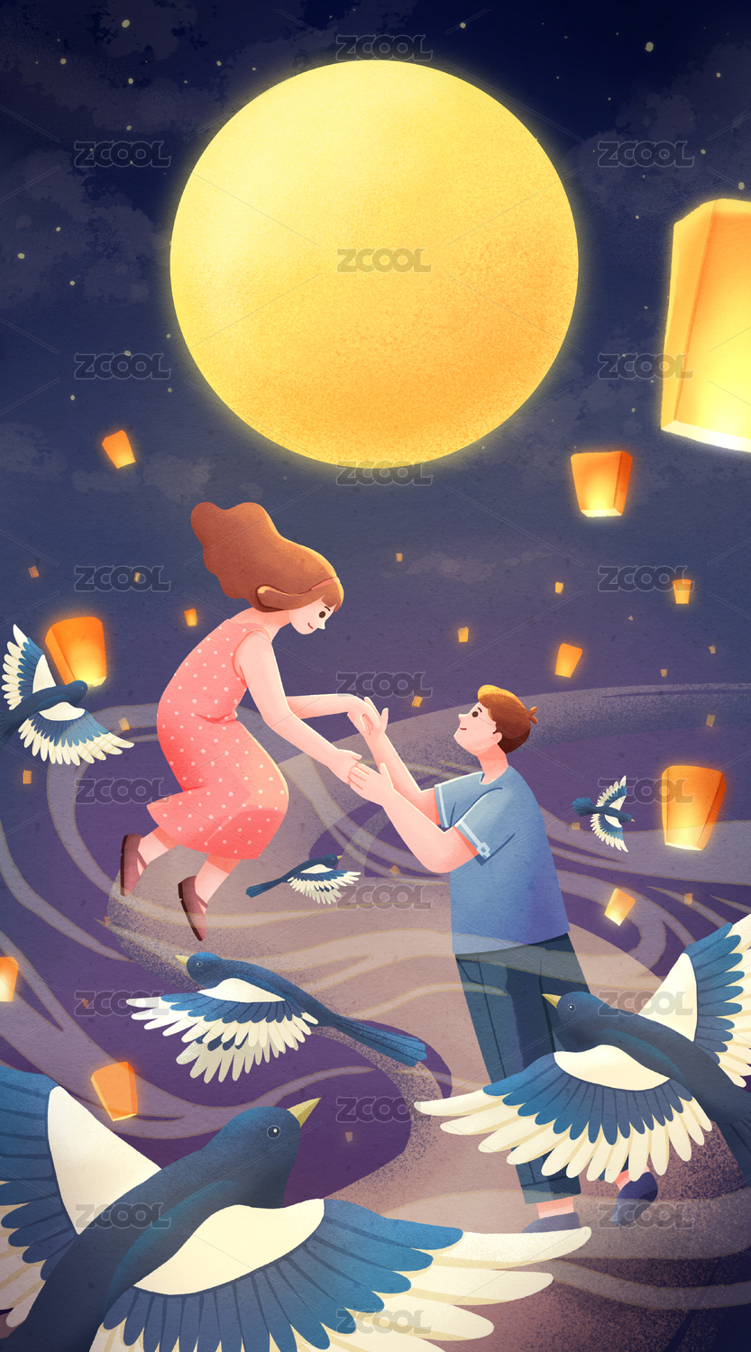 中秋七夕情侣月亮天灯夜晚手绘插画