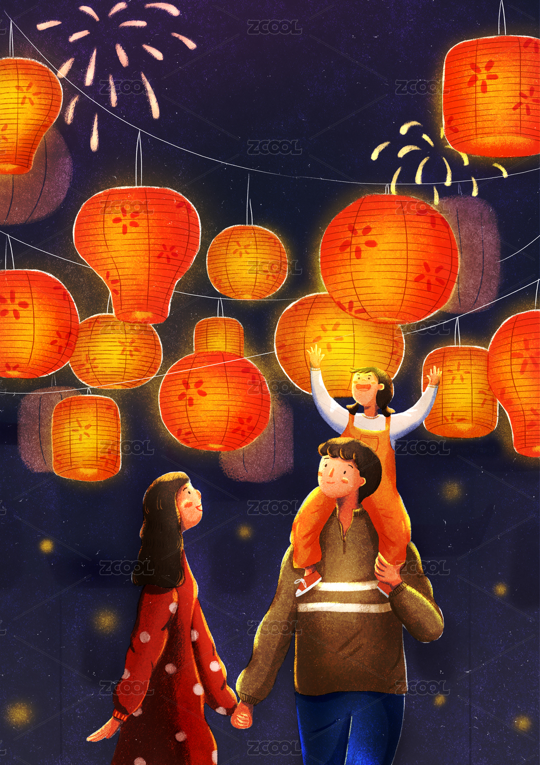 元宵节中秋节一家人看孔明灯挂灯笼猜灯谜赏
