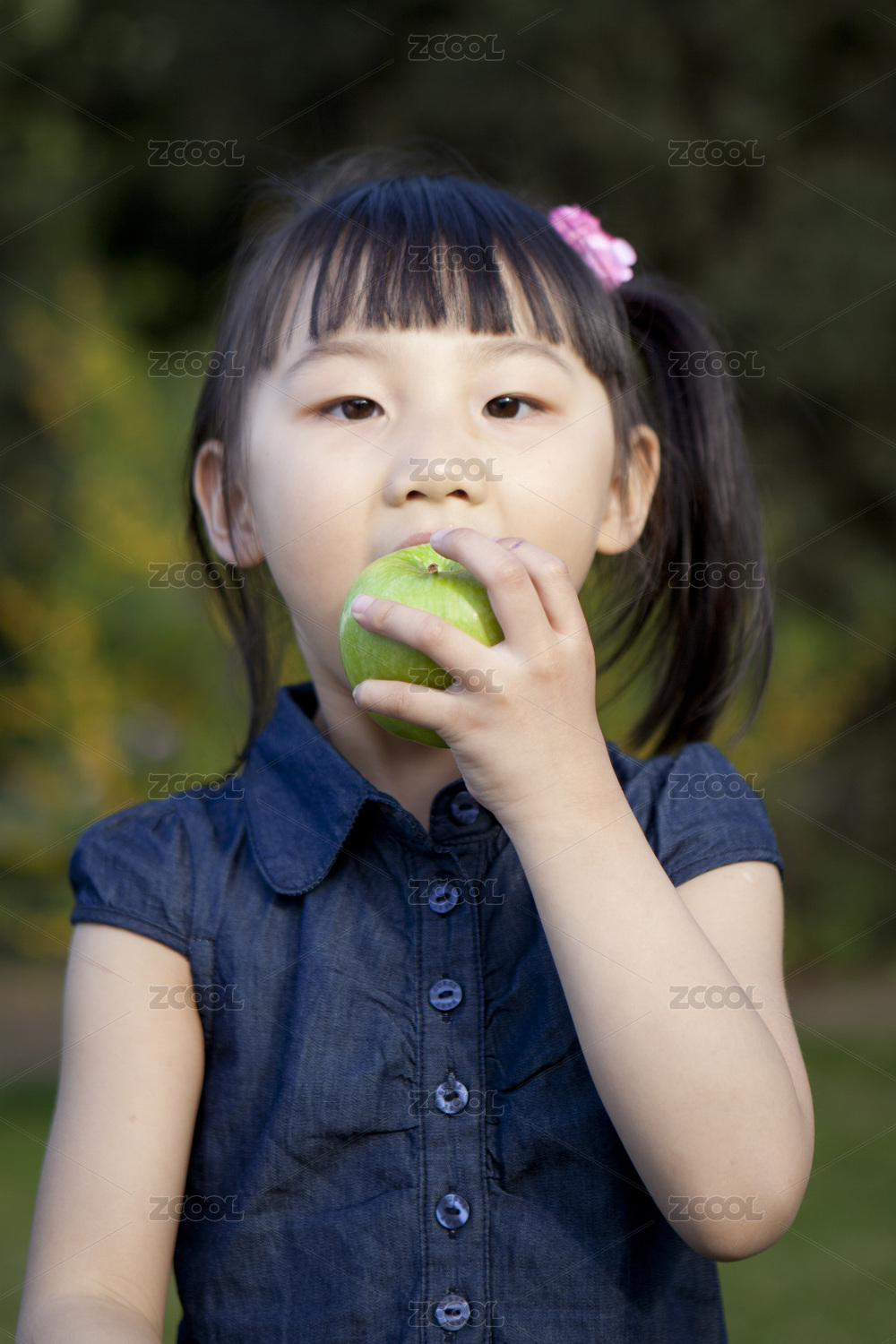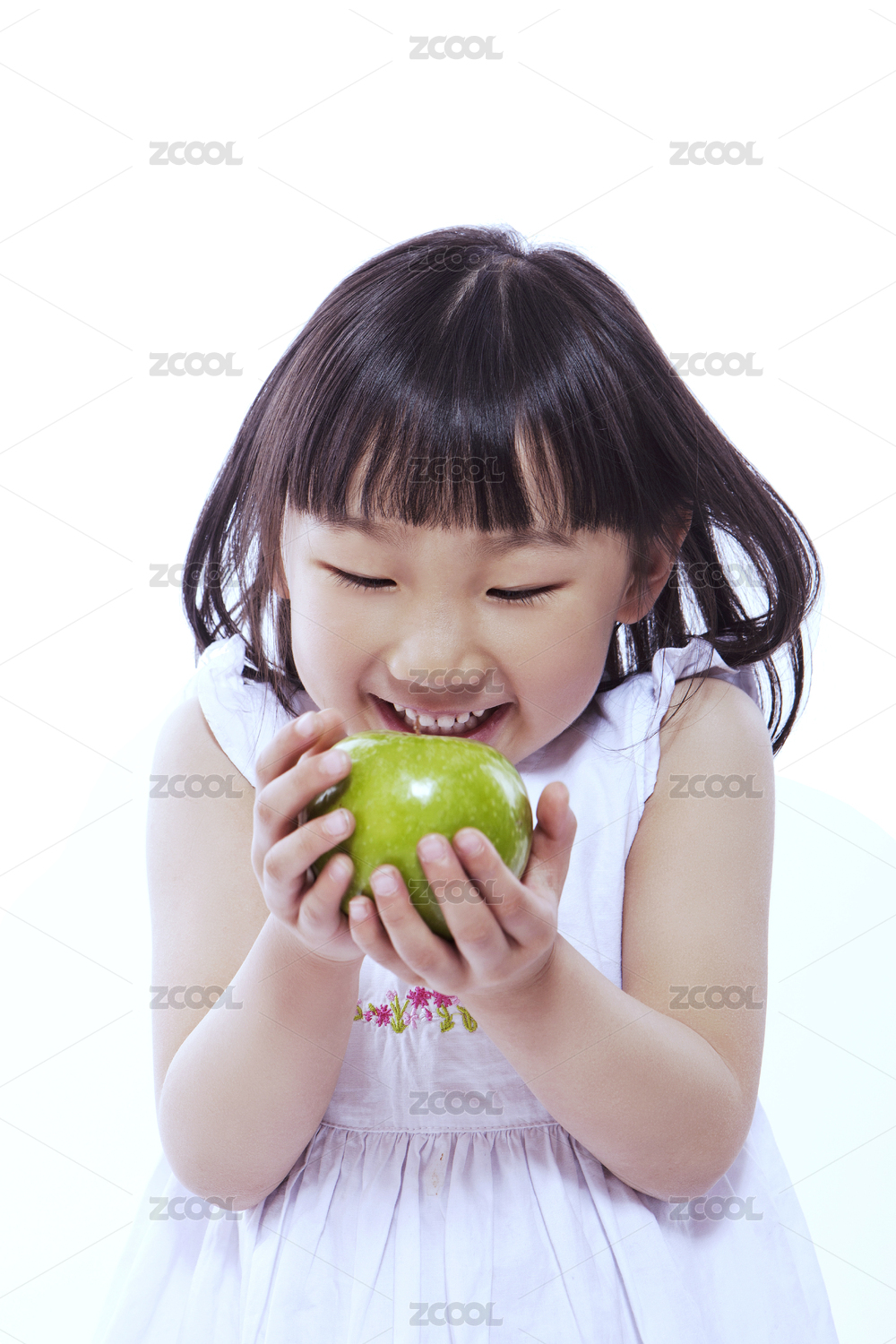 亚洲中国可爱的儿童女孩笑脸表情手拿苹果特写