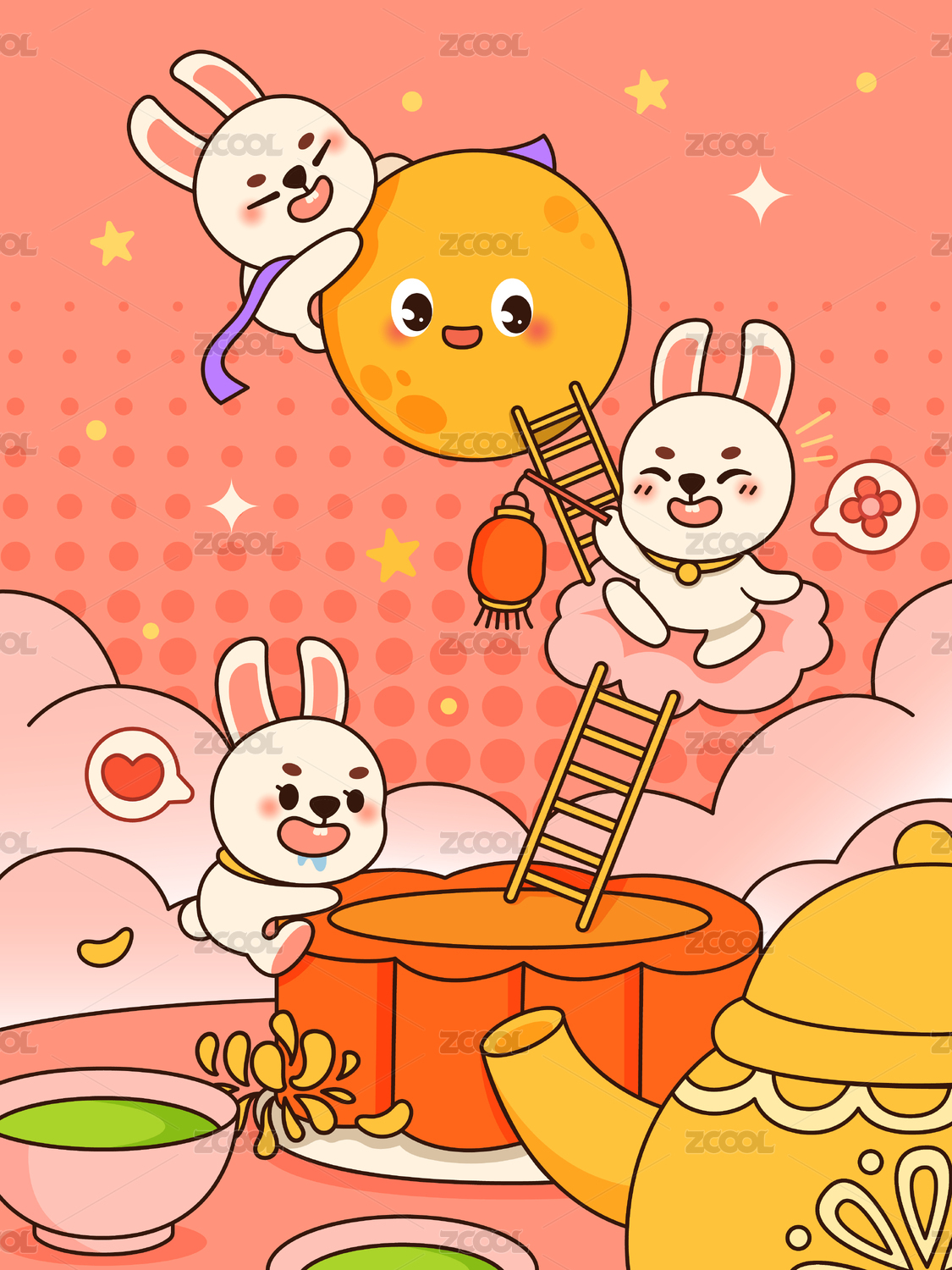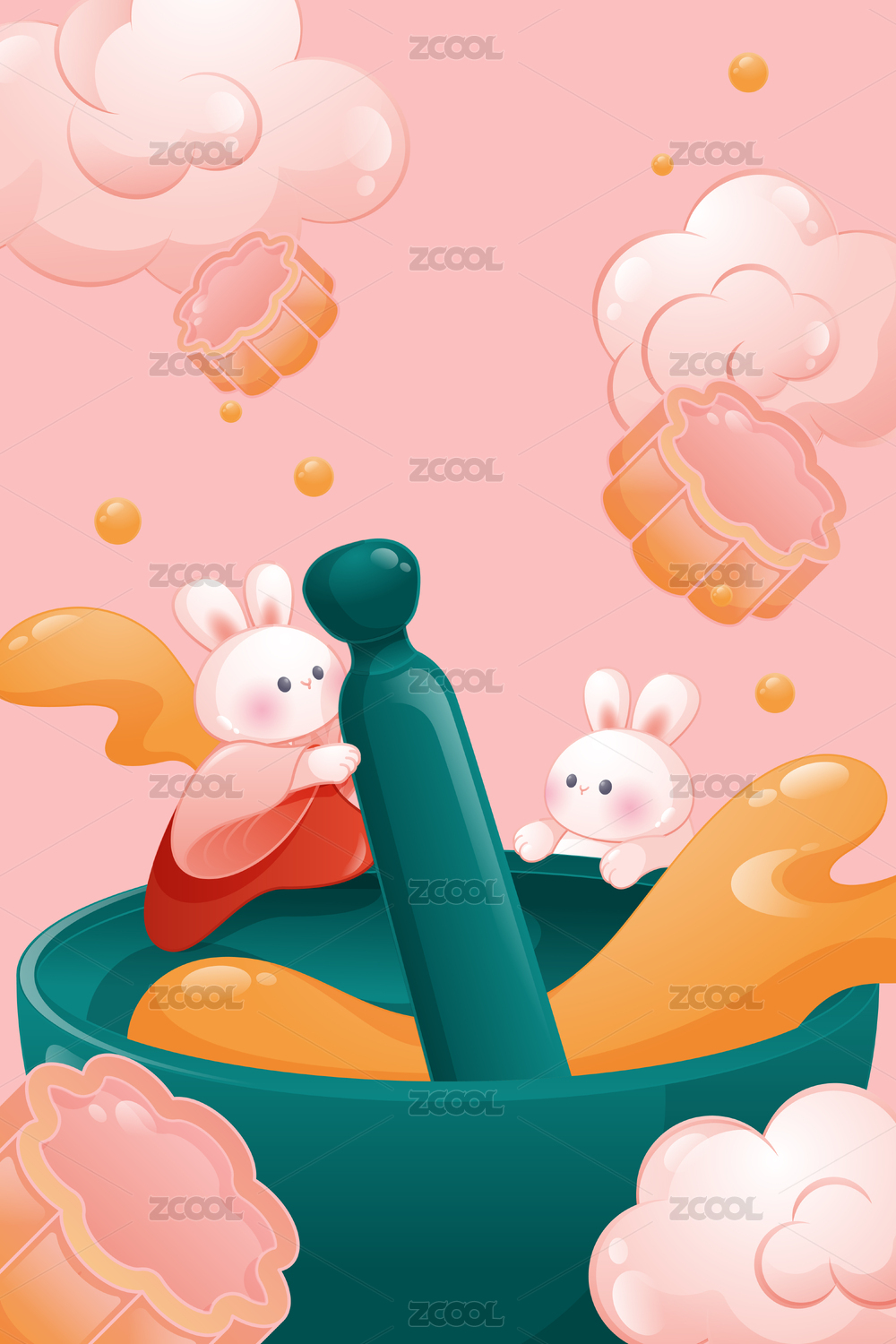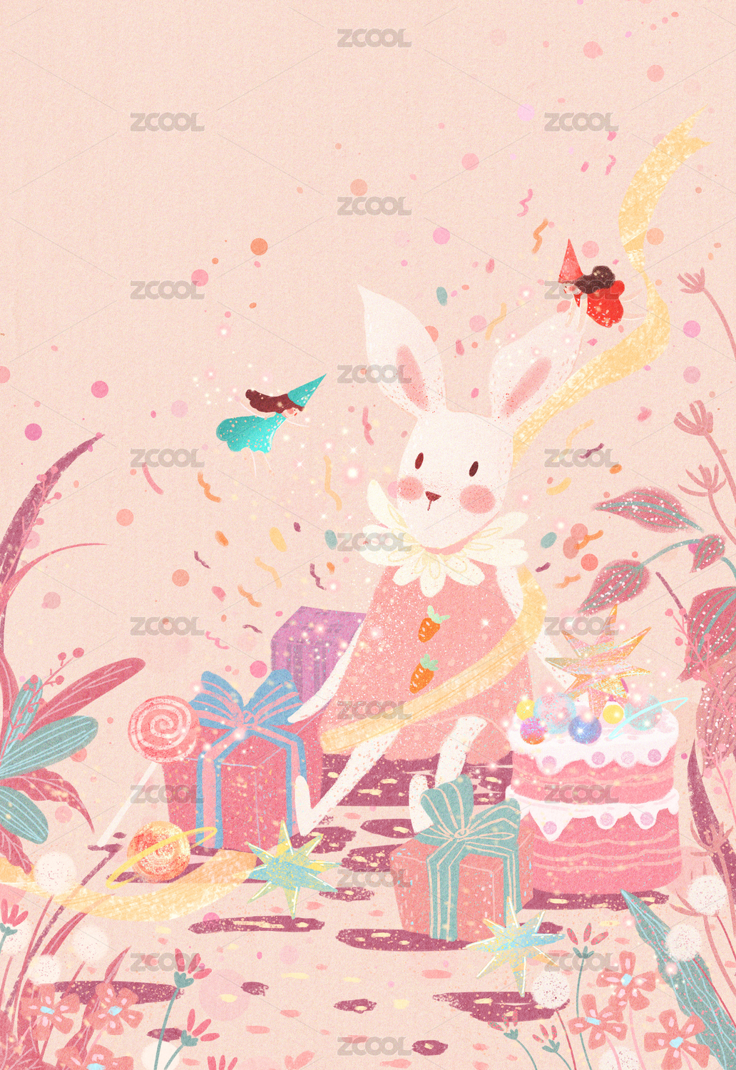 糖果色卡通兔子甜品蛋糕场景插画海报