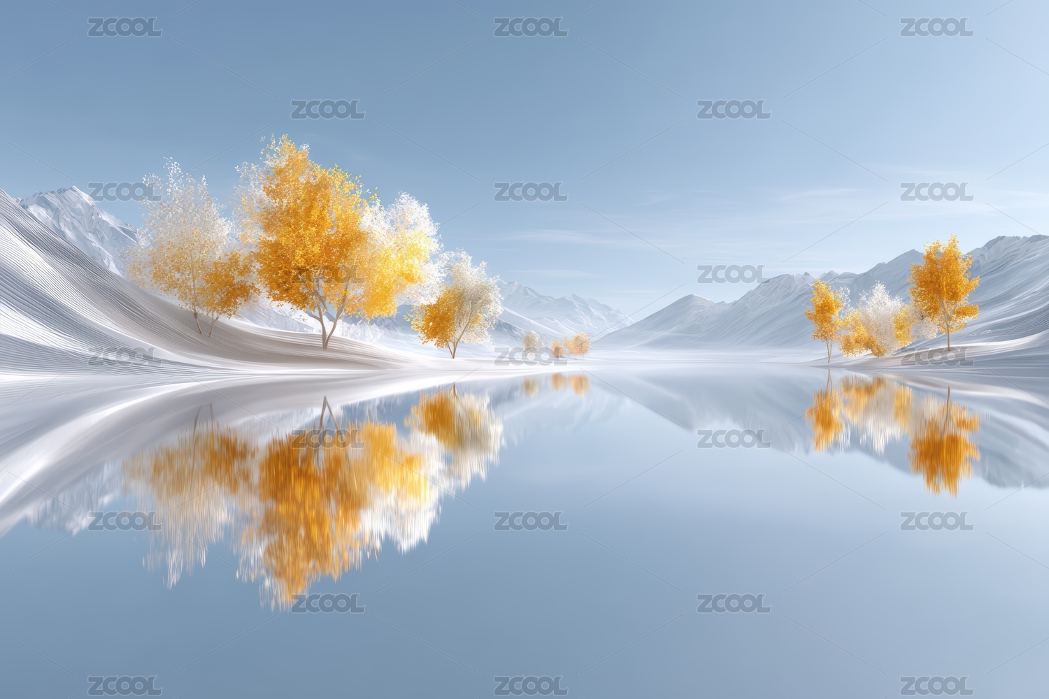 雪山湖畔秋树倒影的梦幻美景