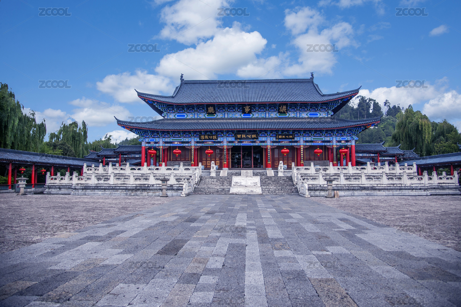 蓝天白云下的中国云南丽江古城木府建筑景观