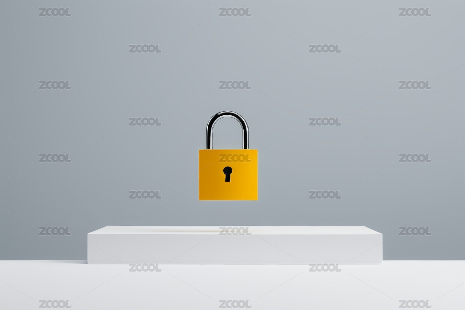 白色平台上有黄色挂锁背景为灰色图片