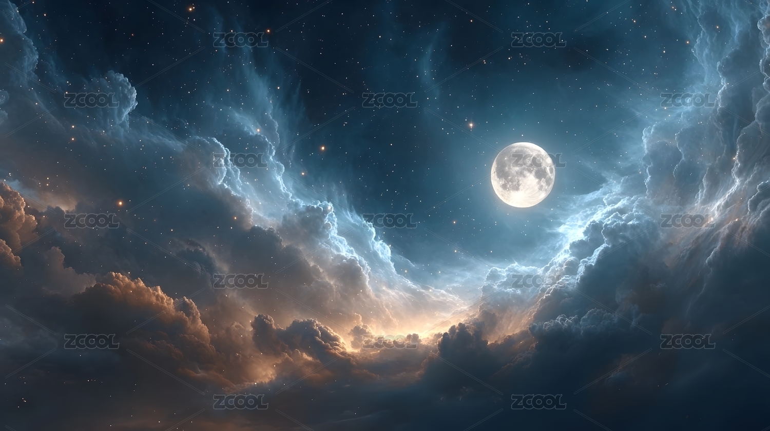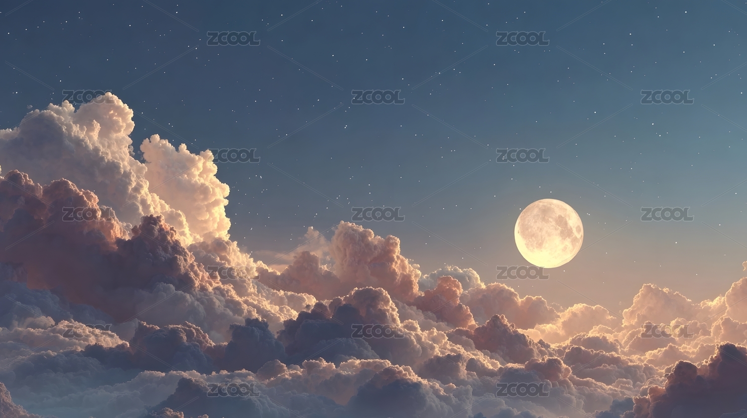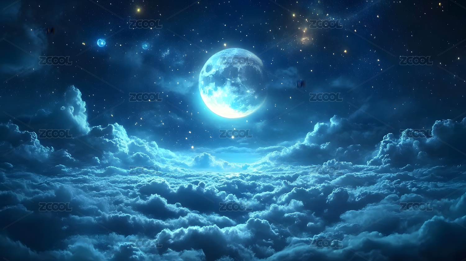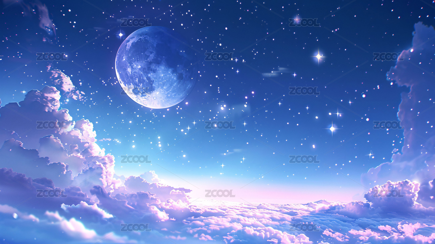深蓝色夜晚梦幻月亮天空云层唯美治愈插画