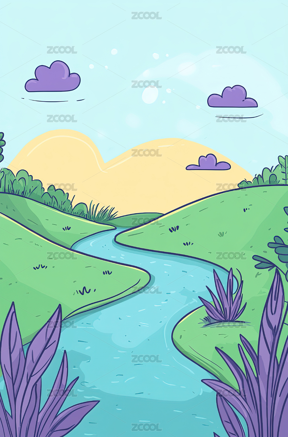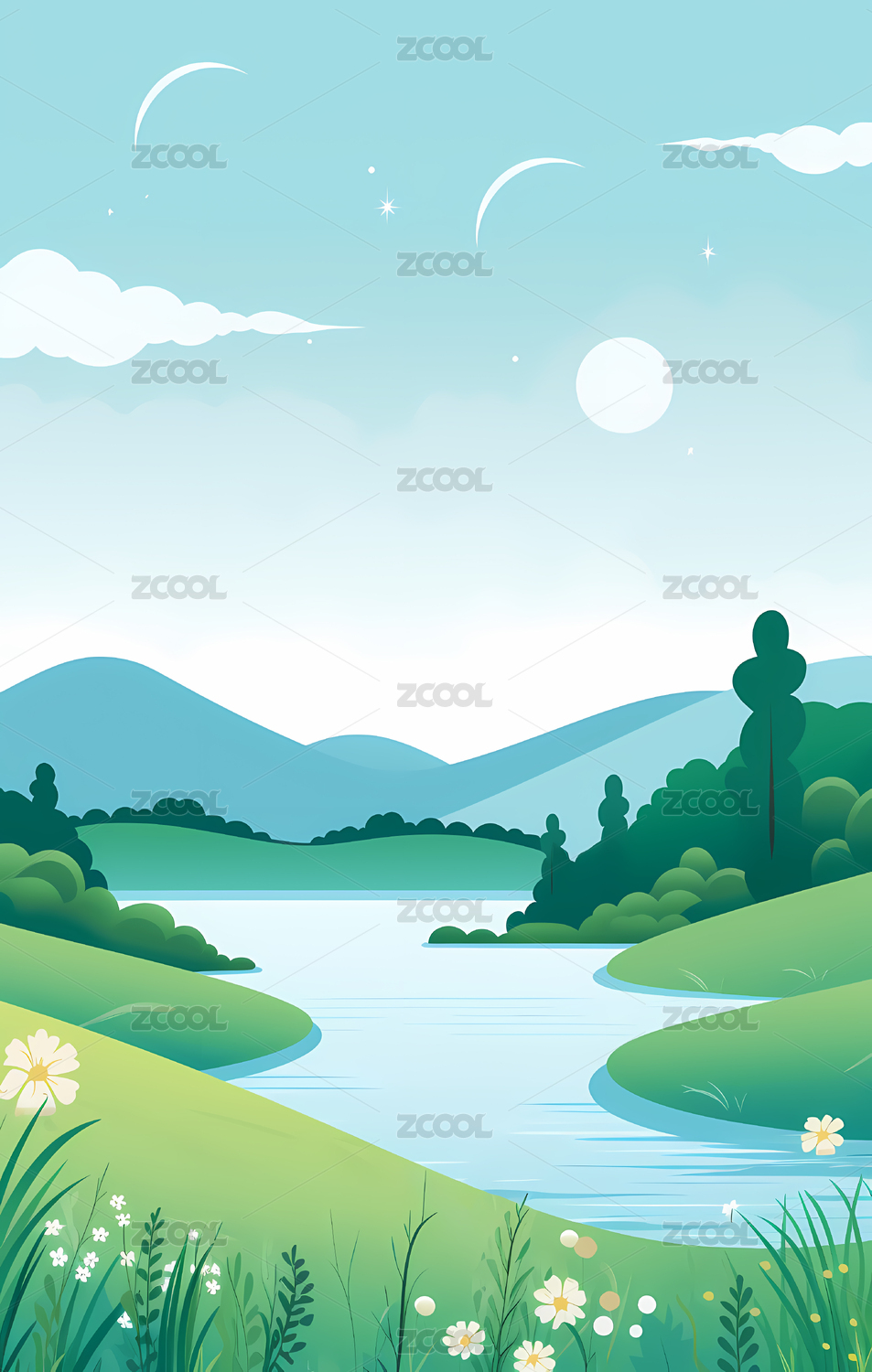 卡通手绘蓝绿渐变风景日出日落插画