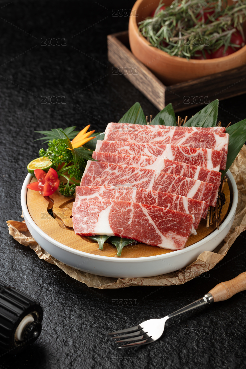 日式盘子里的烧烤烤肉日餐料理食材雪花牛肉