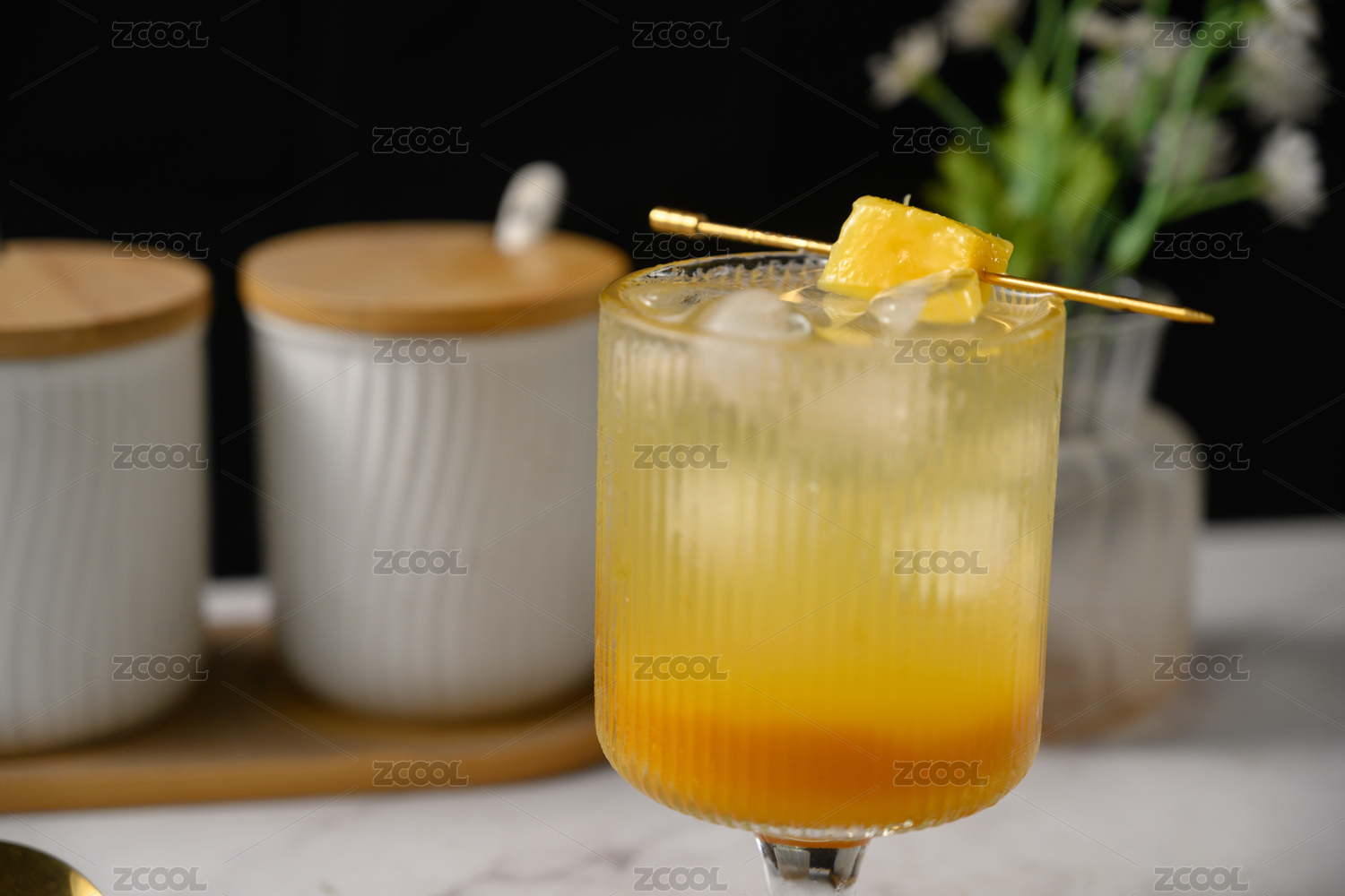 桌面上的杯子里的甘甜可口的冰茶花花茶