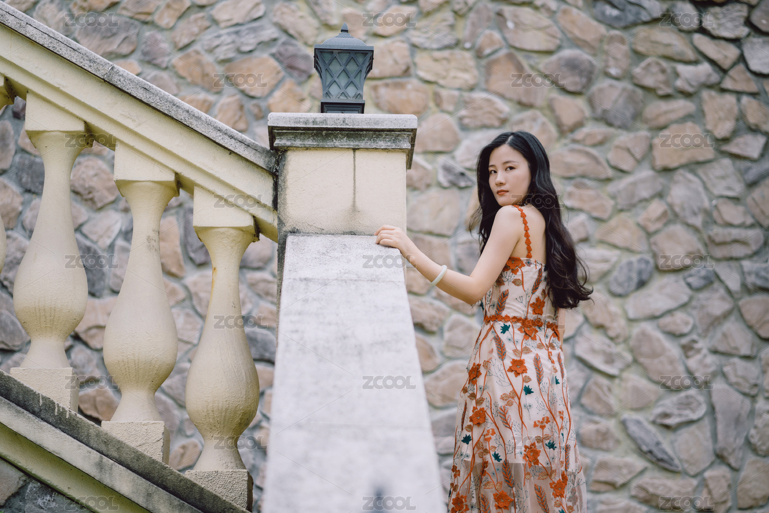 优雅的长裙女孩,走在欧洲风格阶梯上