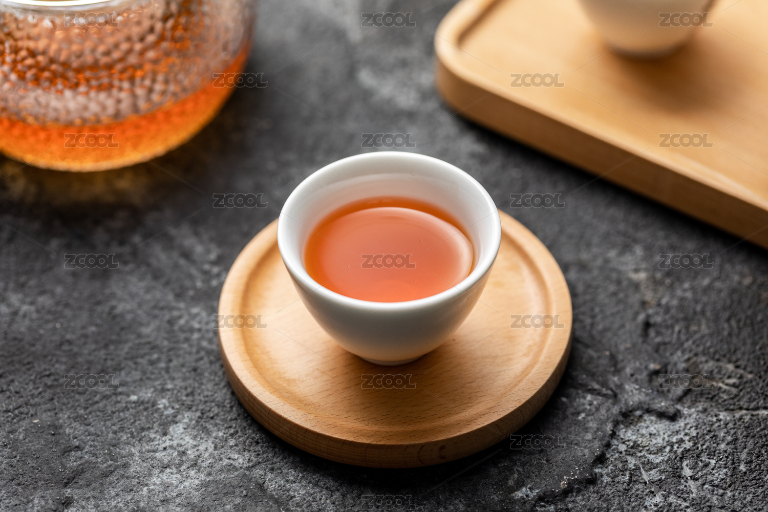 橙色饮料装在白瓷杯搭配木制托盘放在石板上