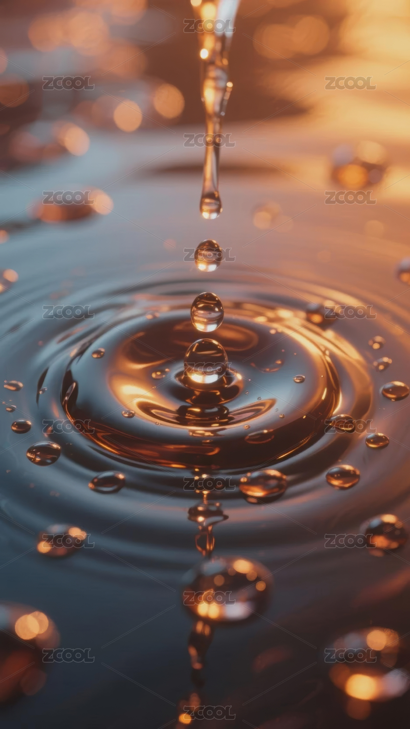 金色水滴飞溅特写在水面3d插图,精华油滴