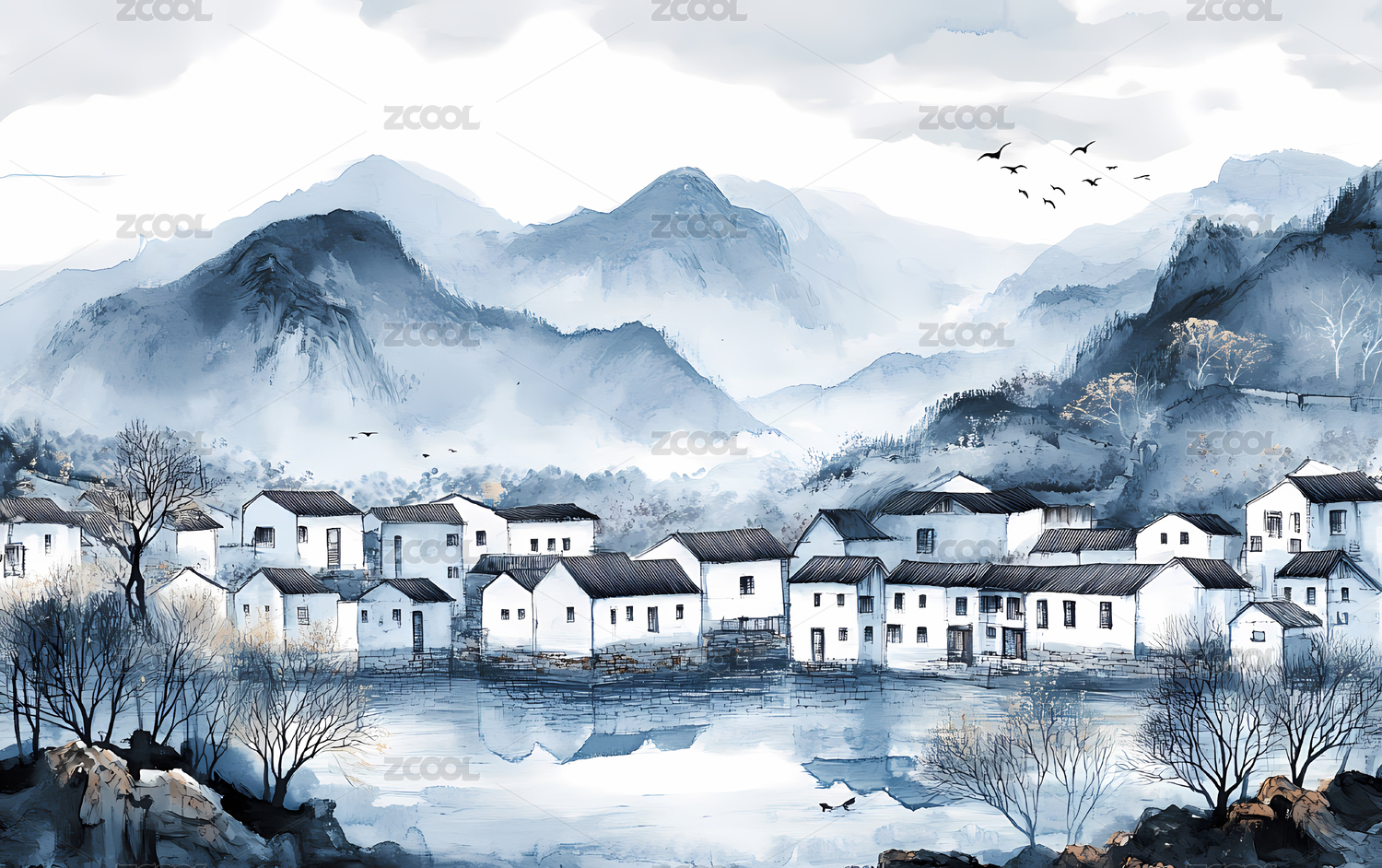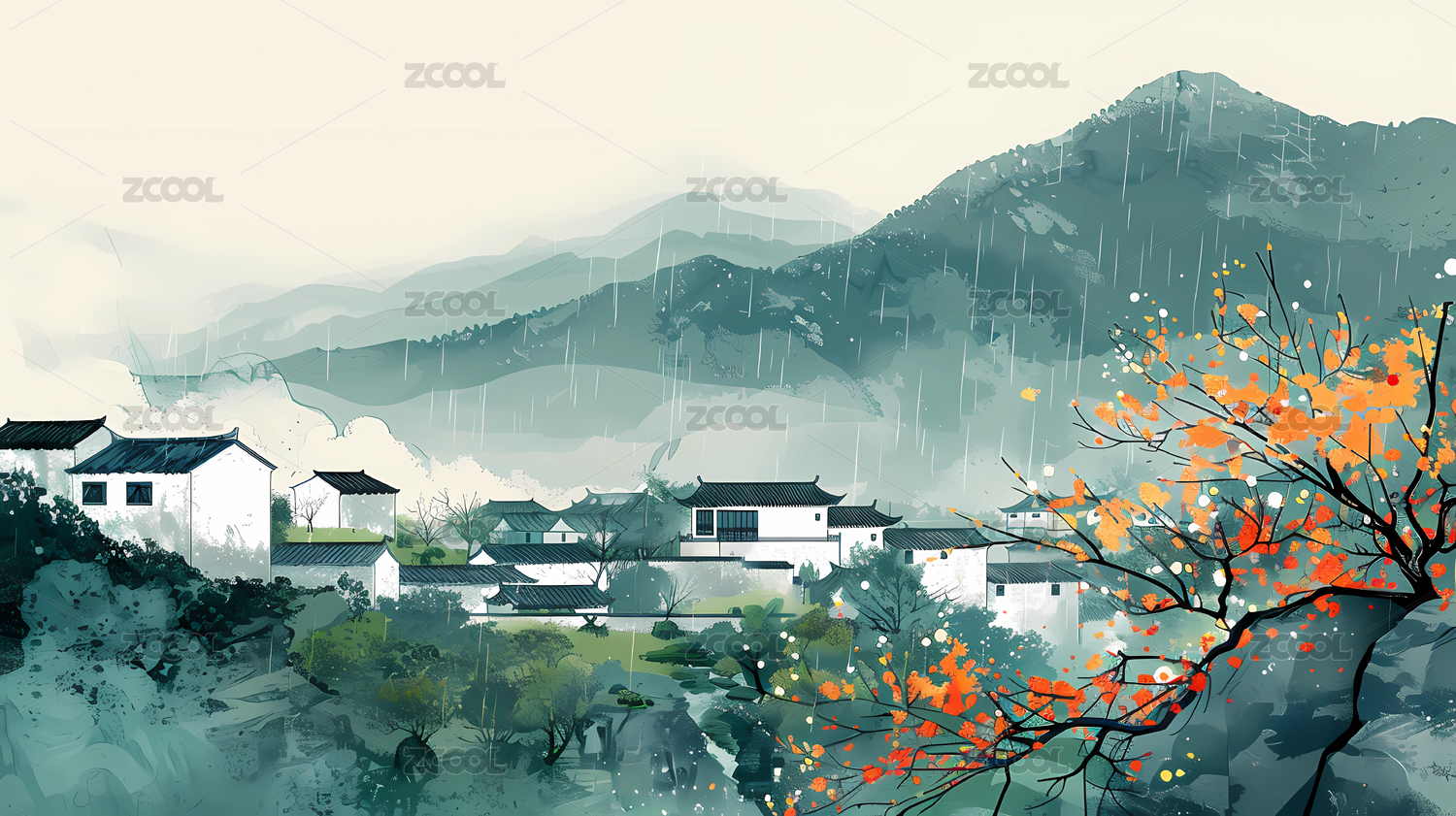 中国水墨画风格江南乡村春天秋天风景