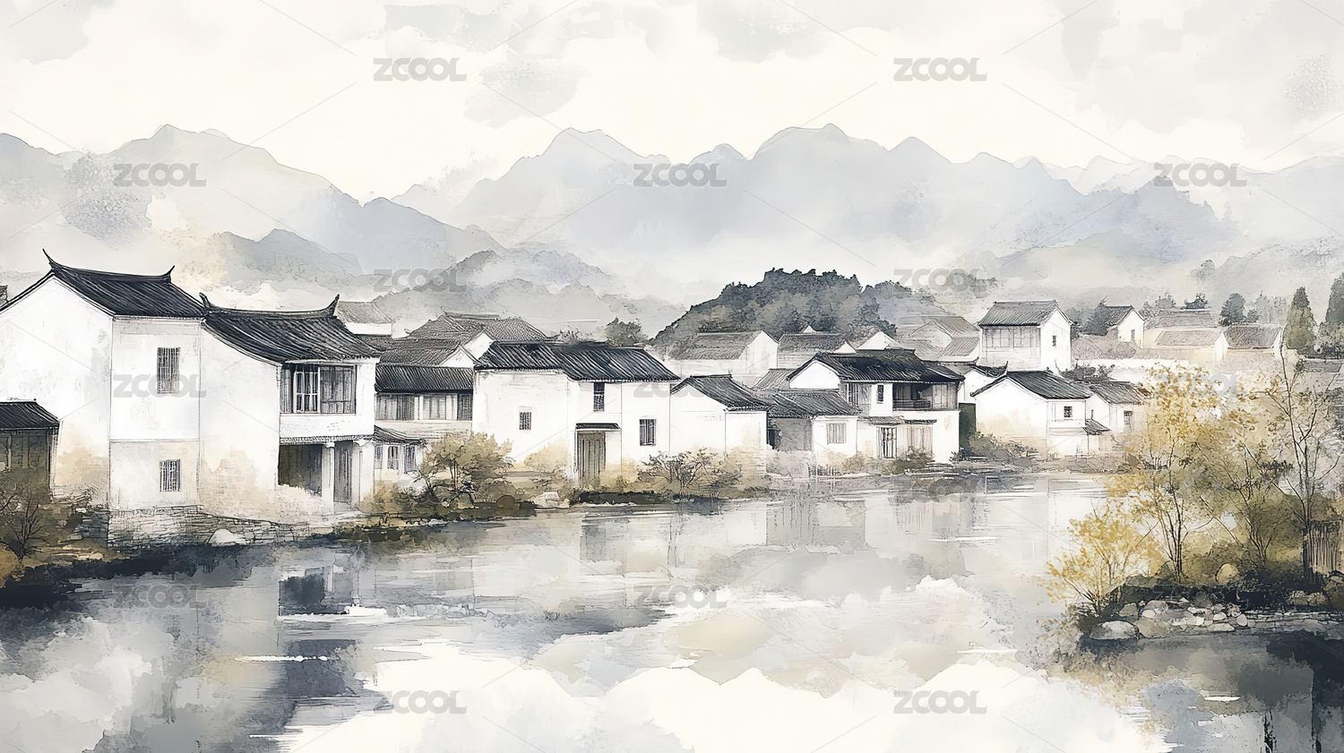 水粉画效果的江南水乡艺术背景