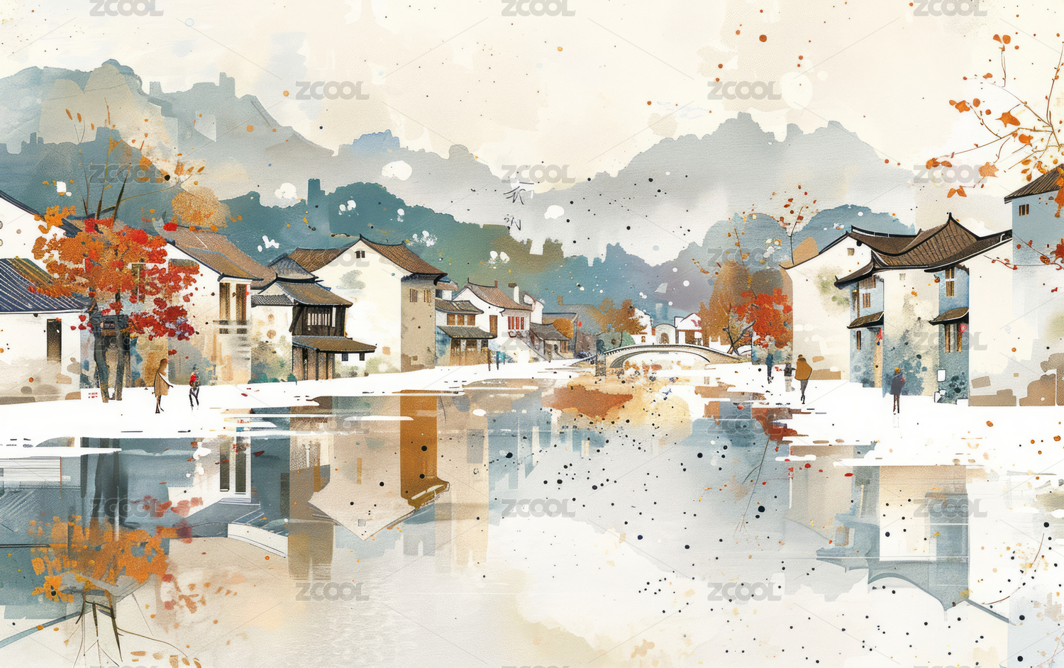 中国小镇水彩画