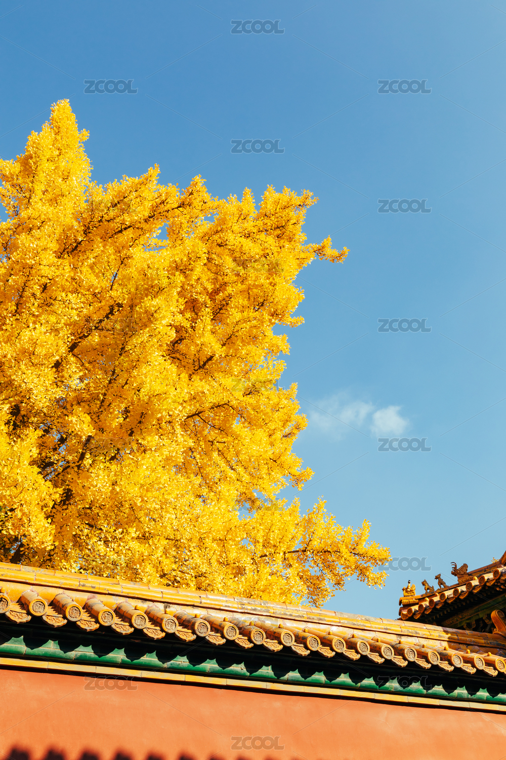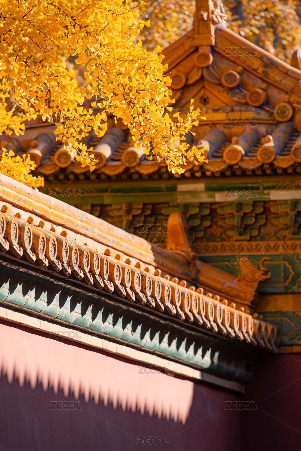 秋天中国辽宁沈阳故宫的宫墙和银杏叶