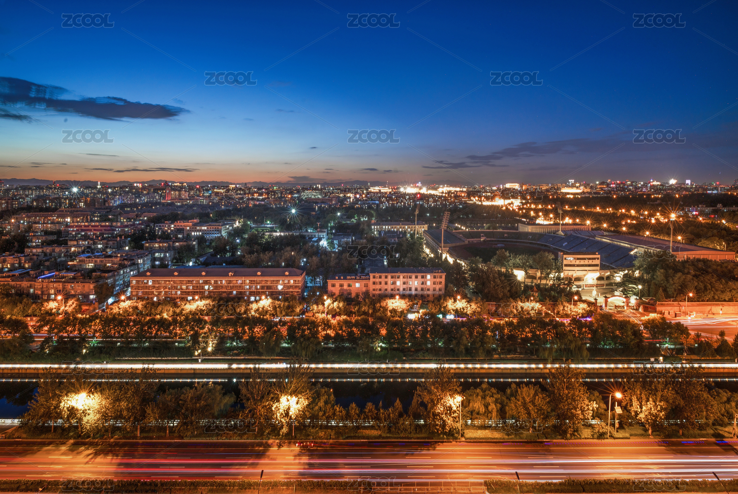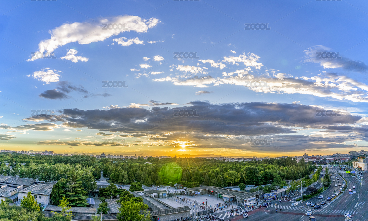 傍晚中国北京中轴线的寿皇殿、鼓楼及其它建筑