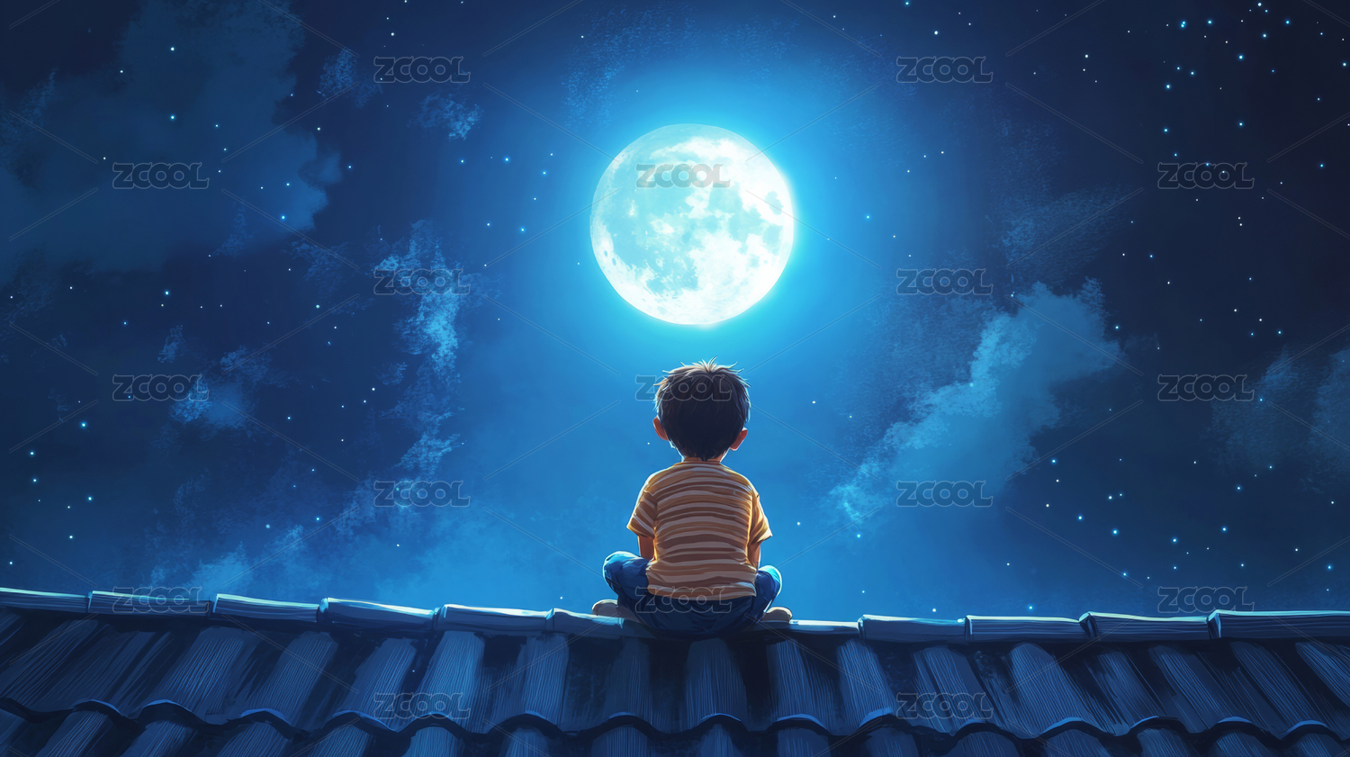 屋顶上坐着的孩子背影,看着夜空的月亮