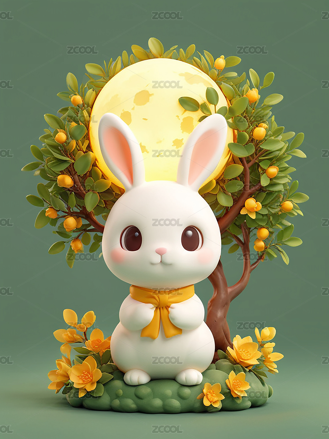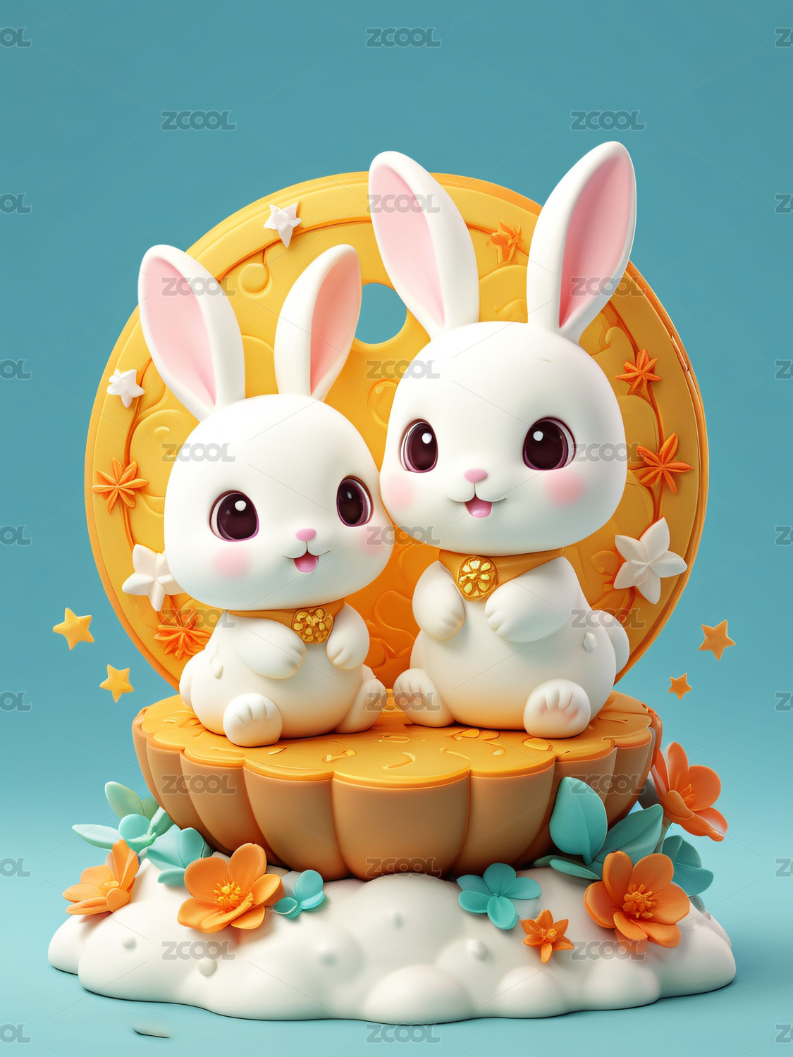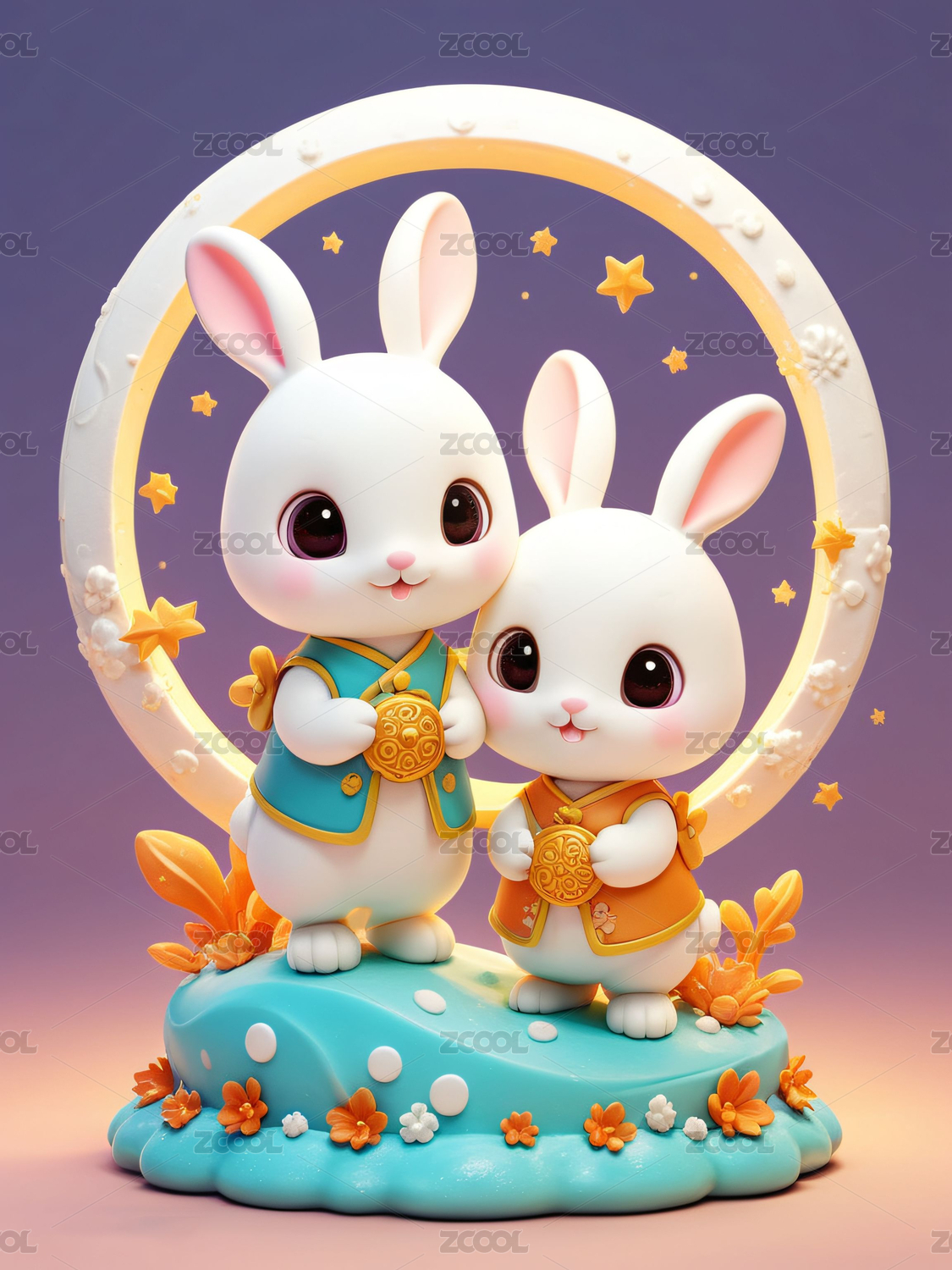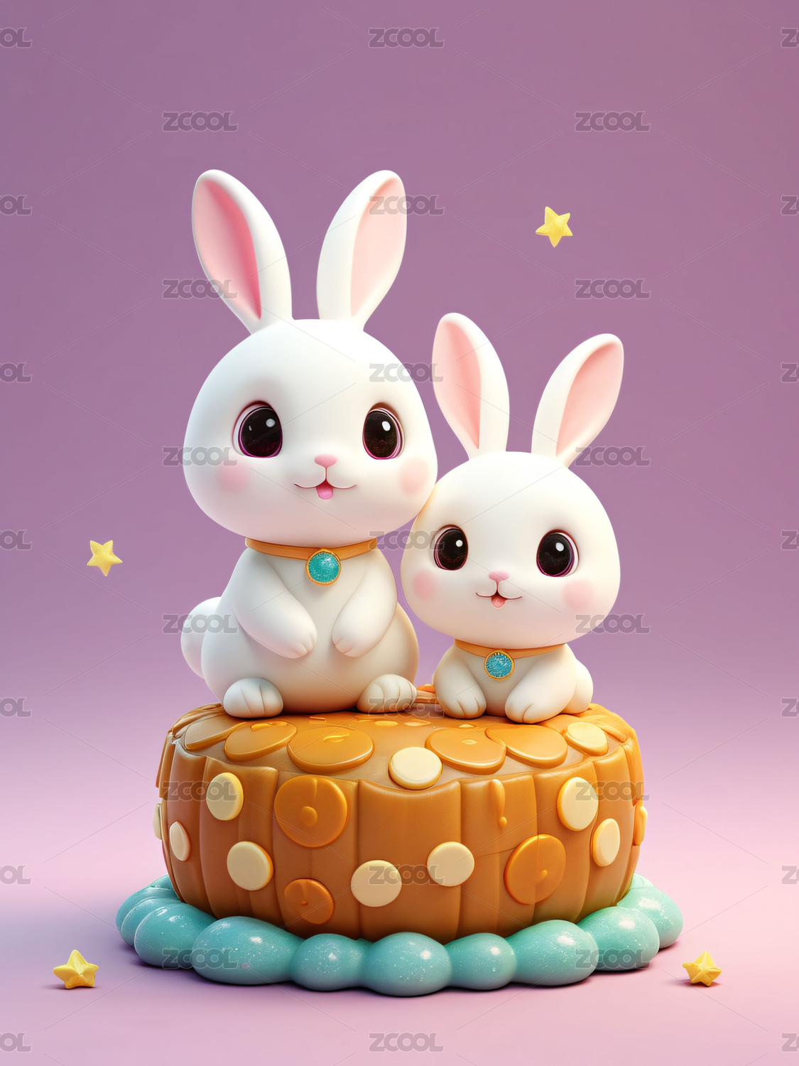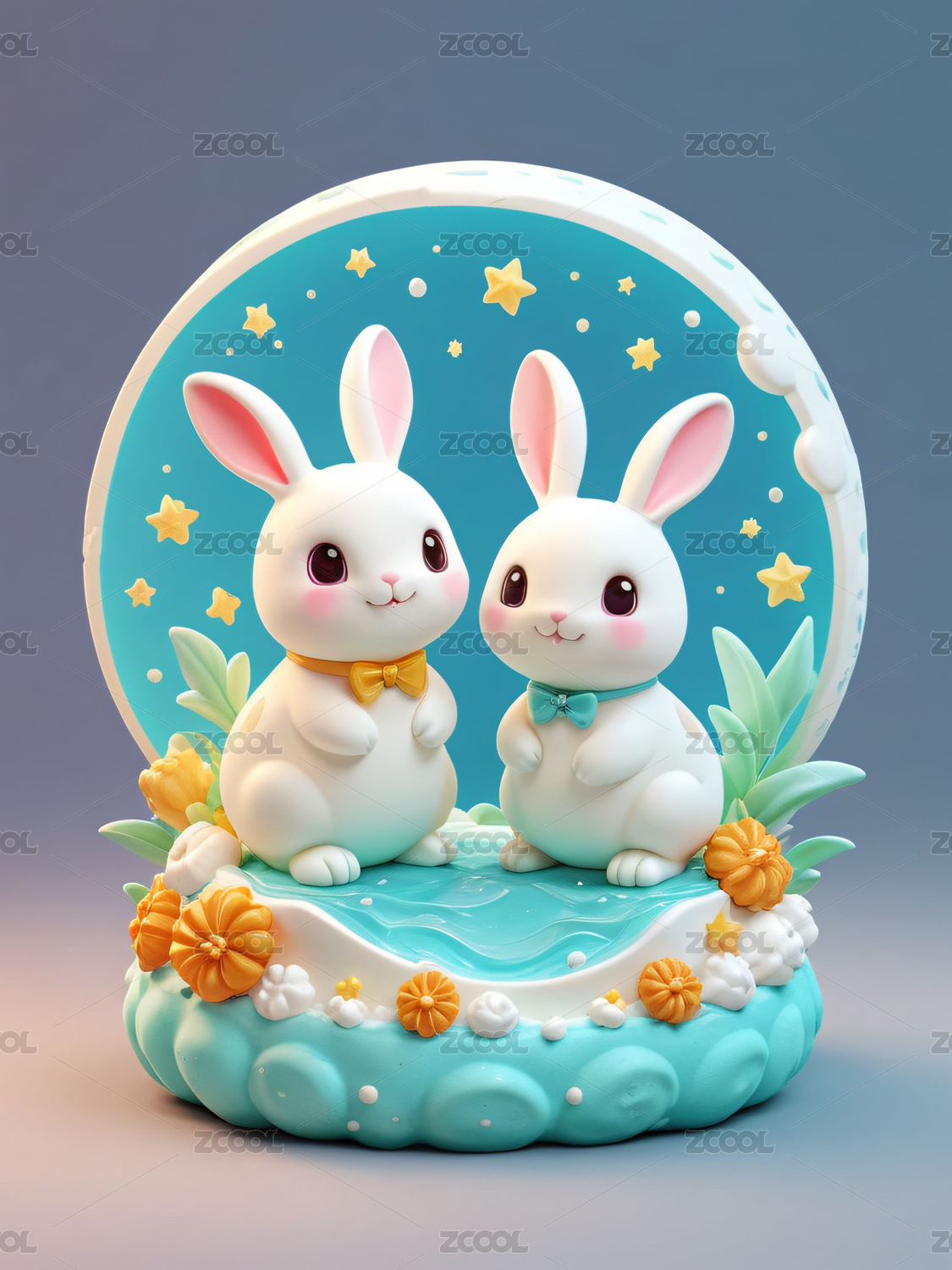 兔子,小白兔,月饼,月亮,中秋,中秋节,卡通,可爱,AIGC202403