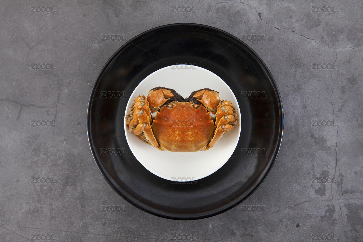 白色磁盘子里蒸熟的红色的螃蟹,顶视图