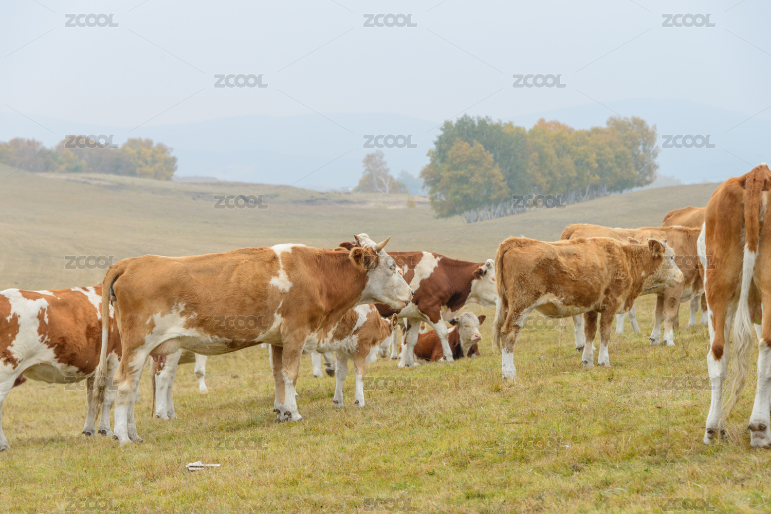 秋天内蒙古赤峰坝上草原河滩吃草的奶牛