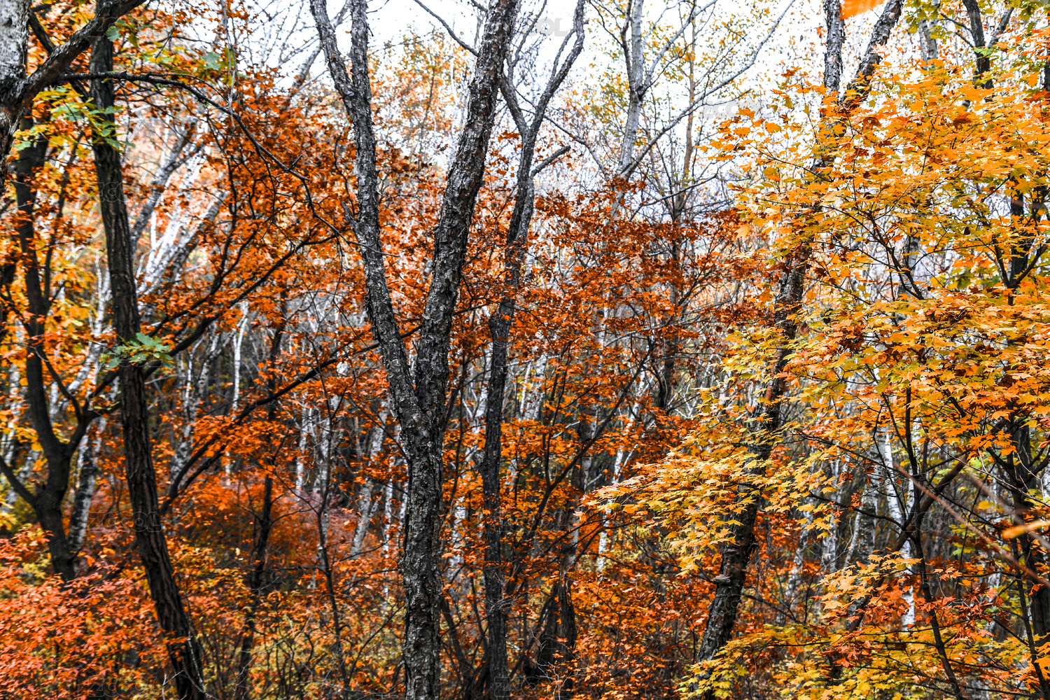 中国辽宁抚顺秋季山谷白桦林枫树红叶秋色