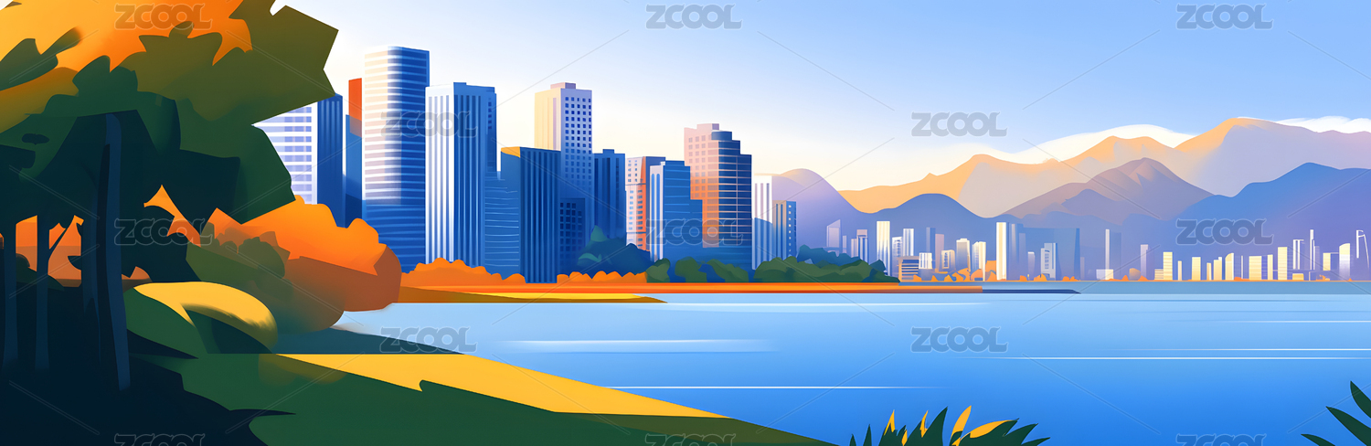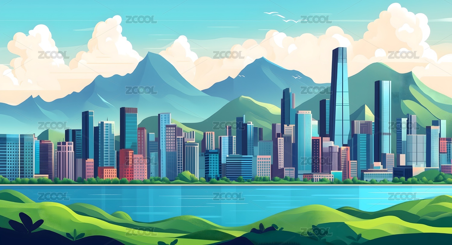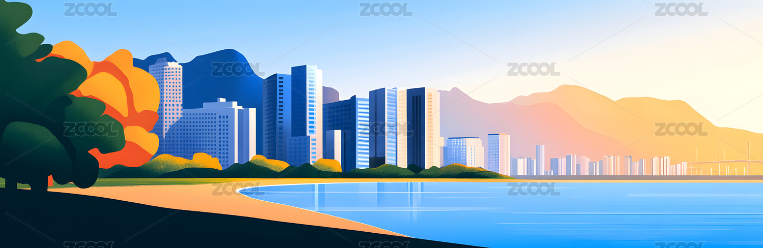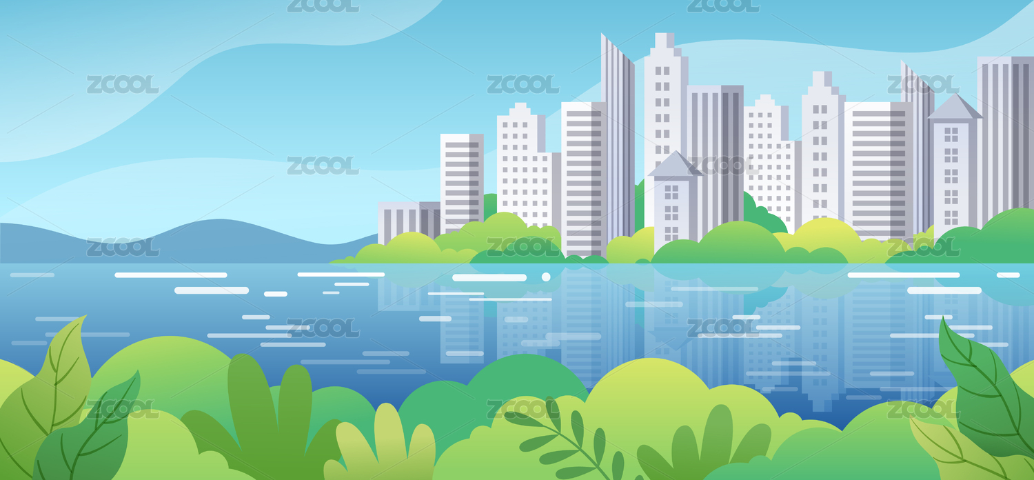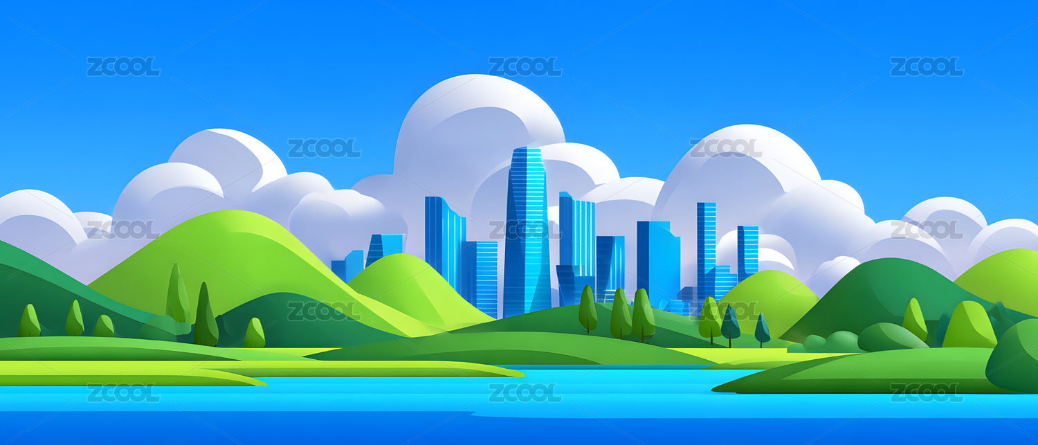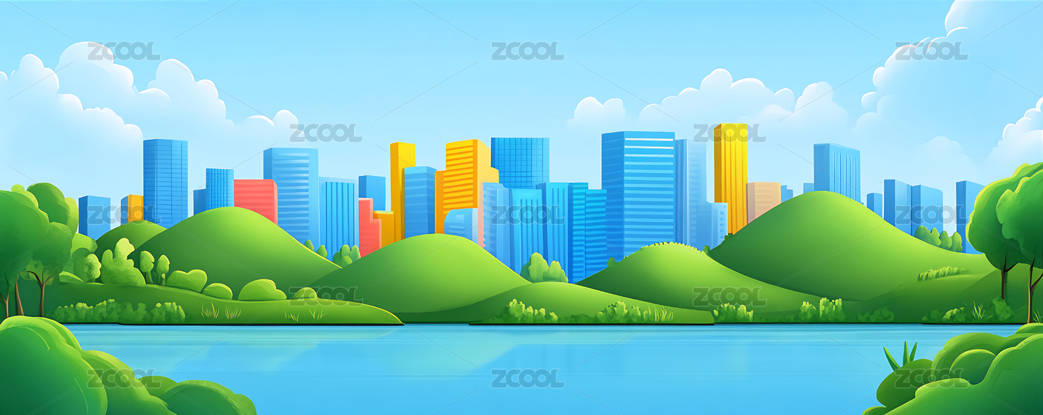 卡通城市与山丘风景插画