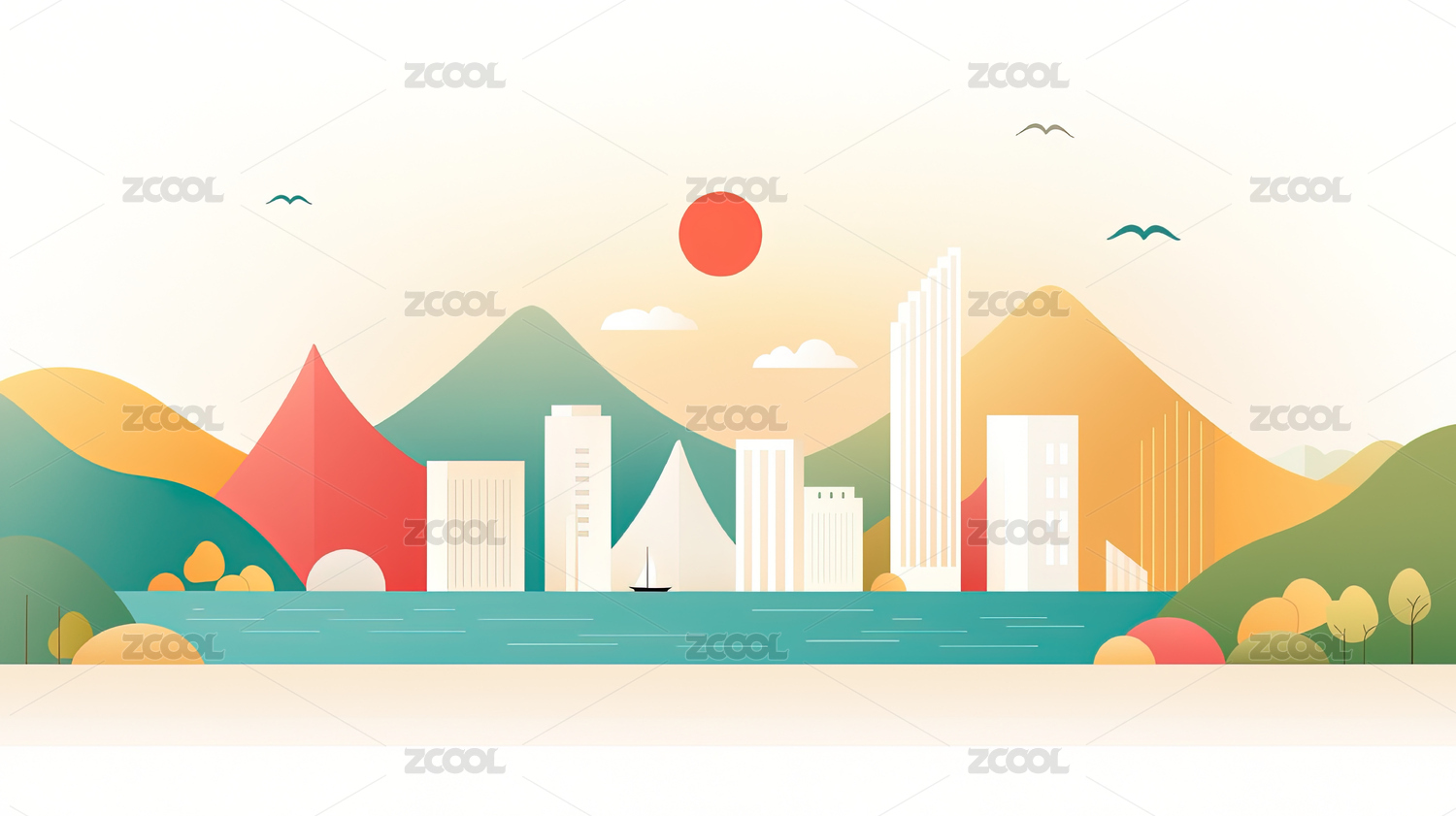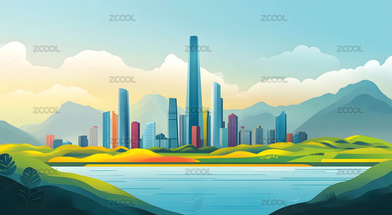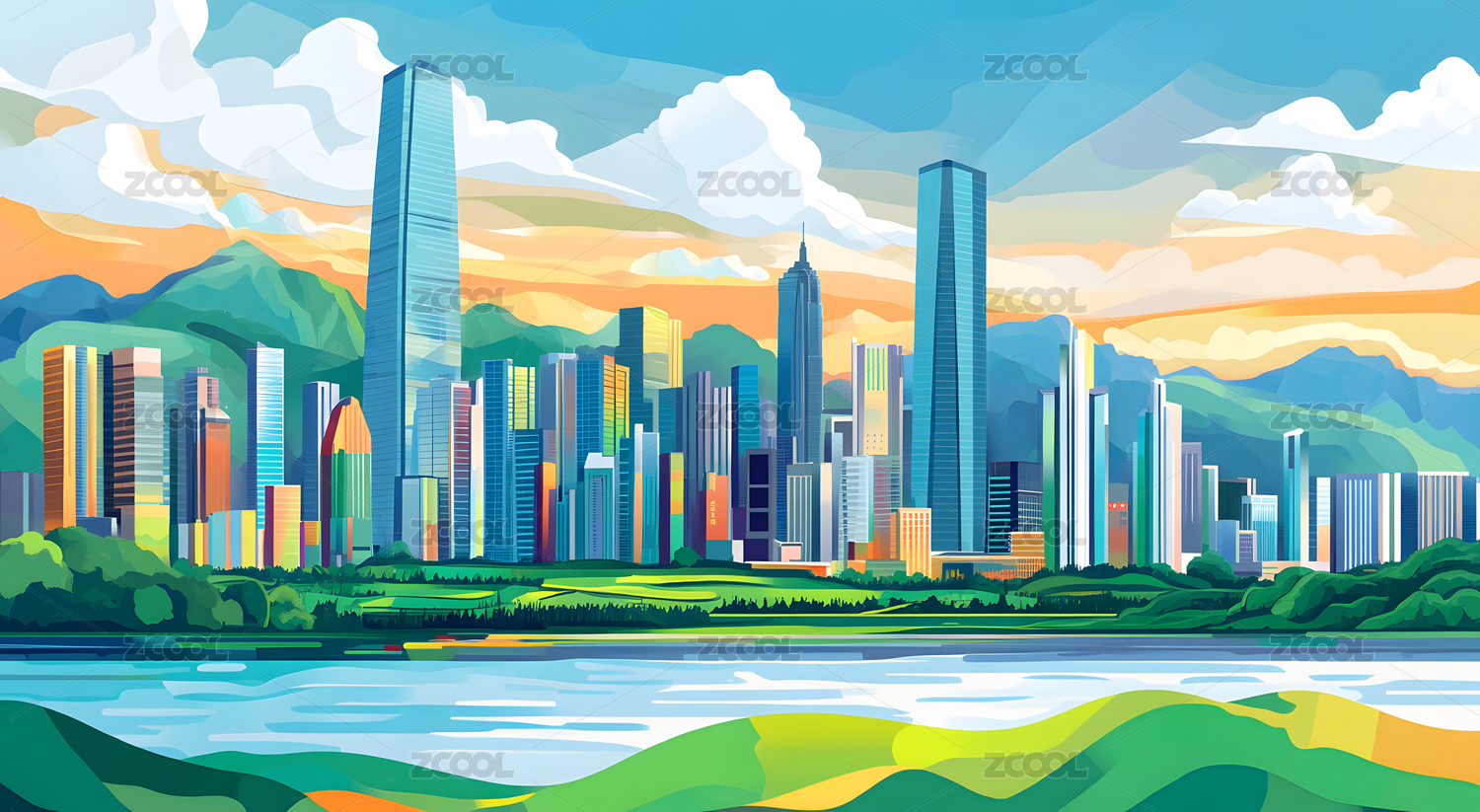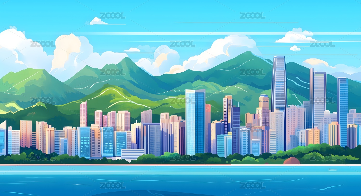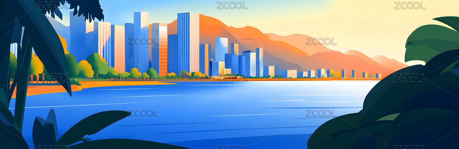 卡通城市与山丘风景插画