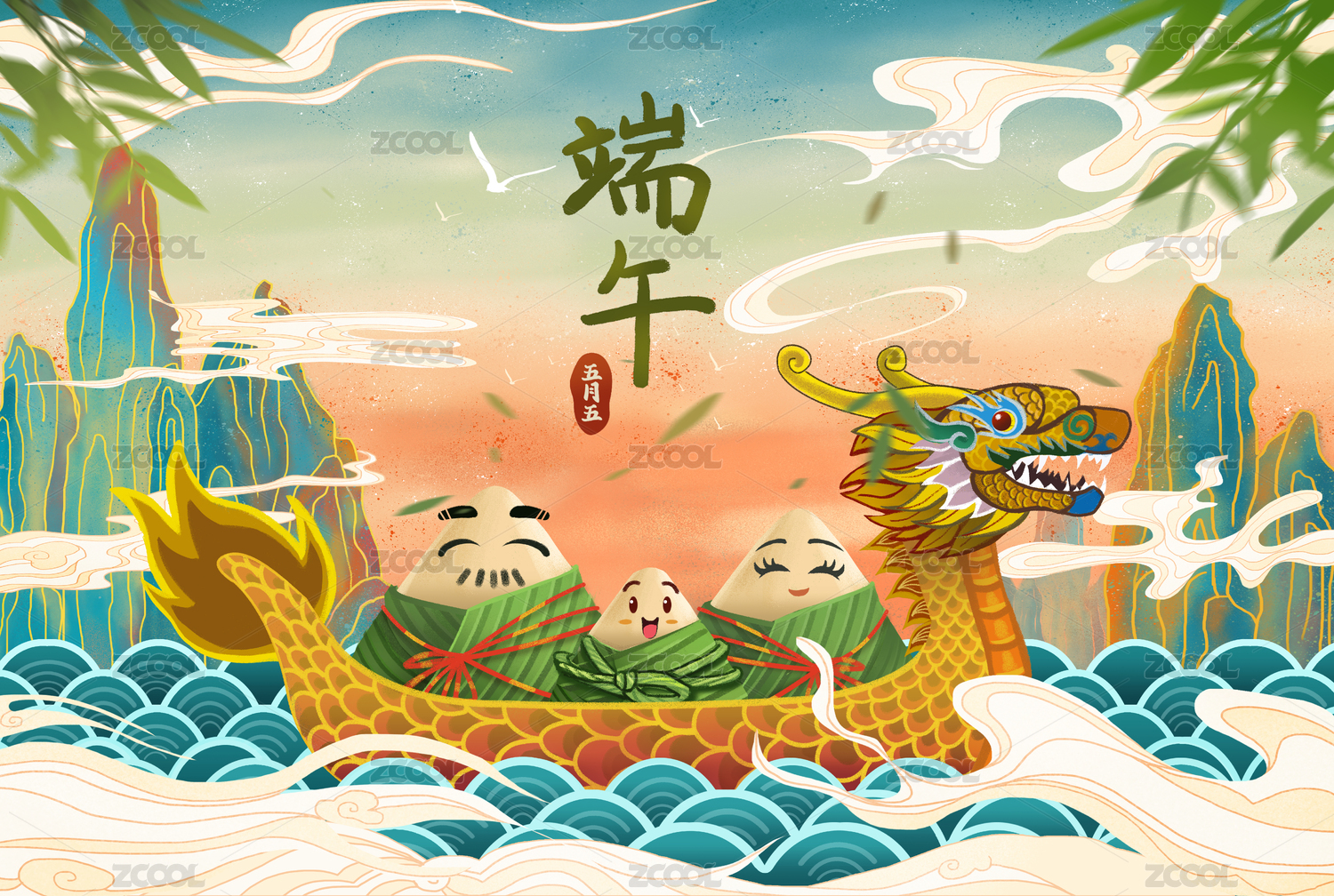 端午节,龙舟,粽子,水,山,云纹