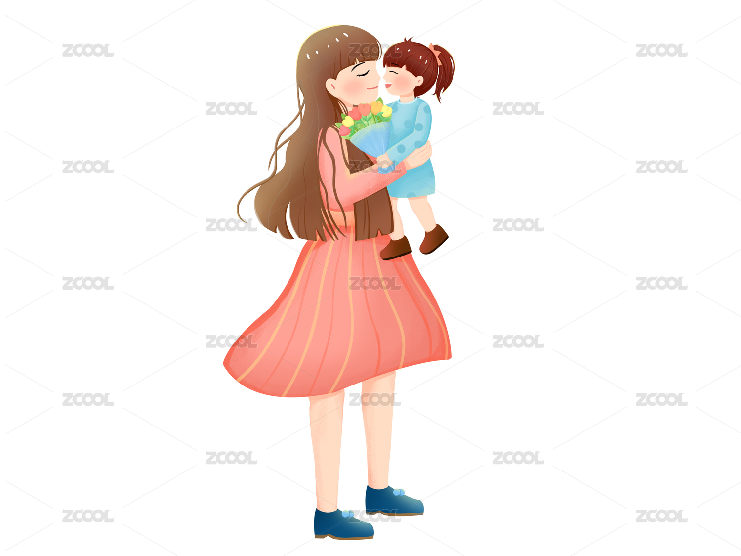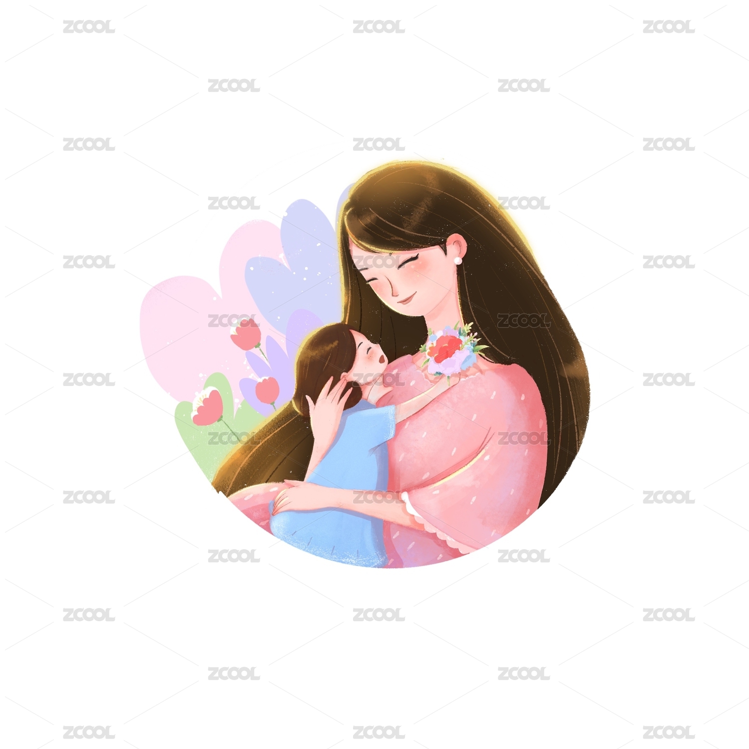 母亲怀抱着小孩鲜花环绕母亲节温馨插画