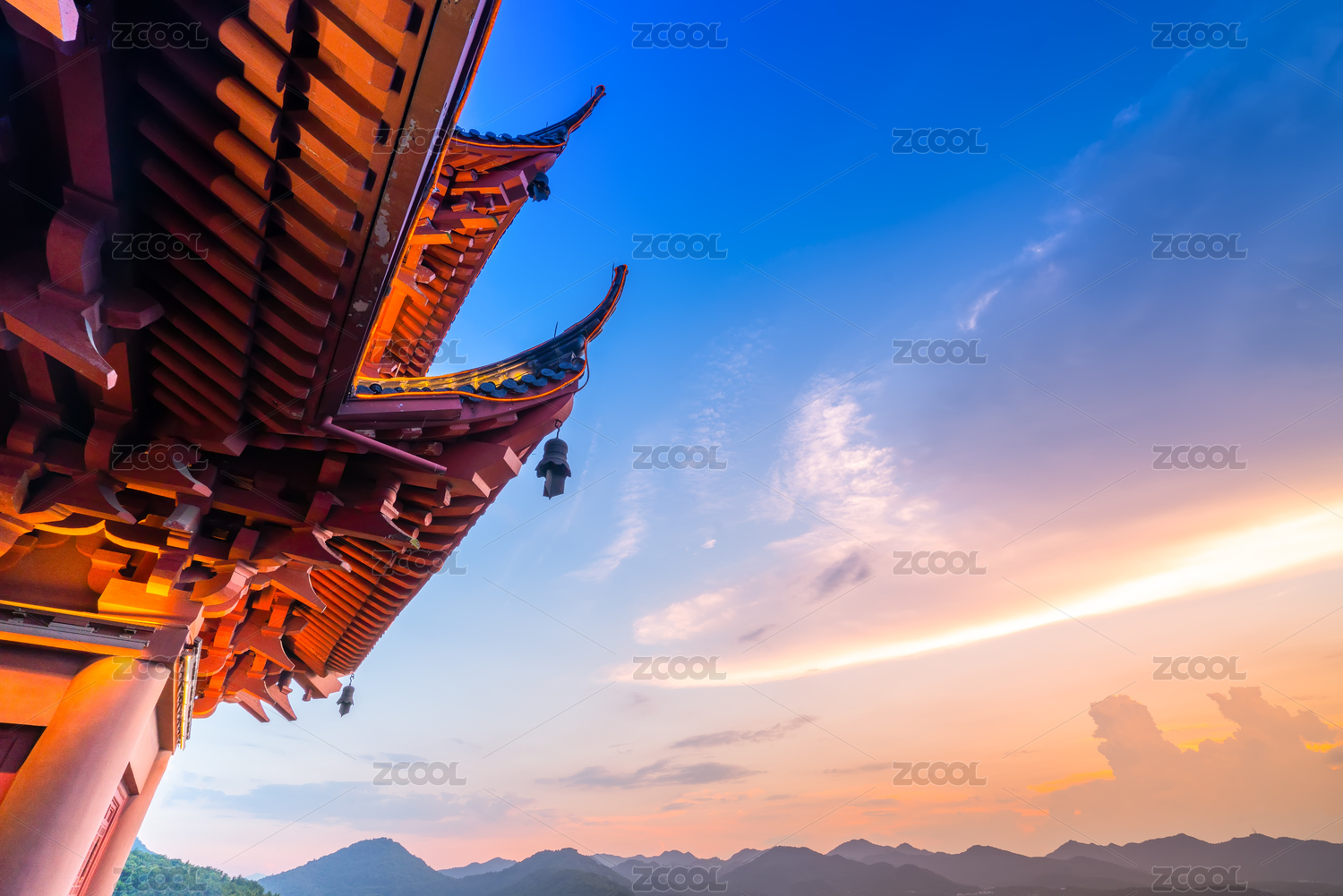 夕阳天空背景中的中式建筑飞檐翘角特写
