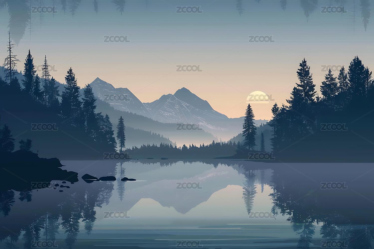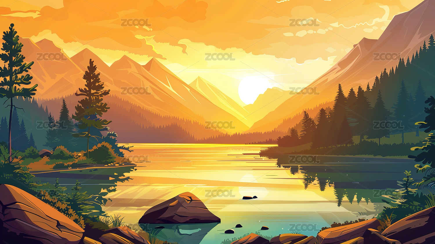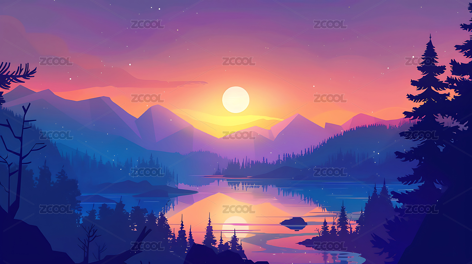 日落,湖泊,山脉,树木,岛屿,反射,天空,云彩,光线,颜色
