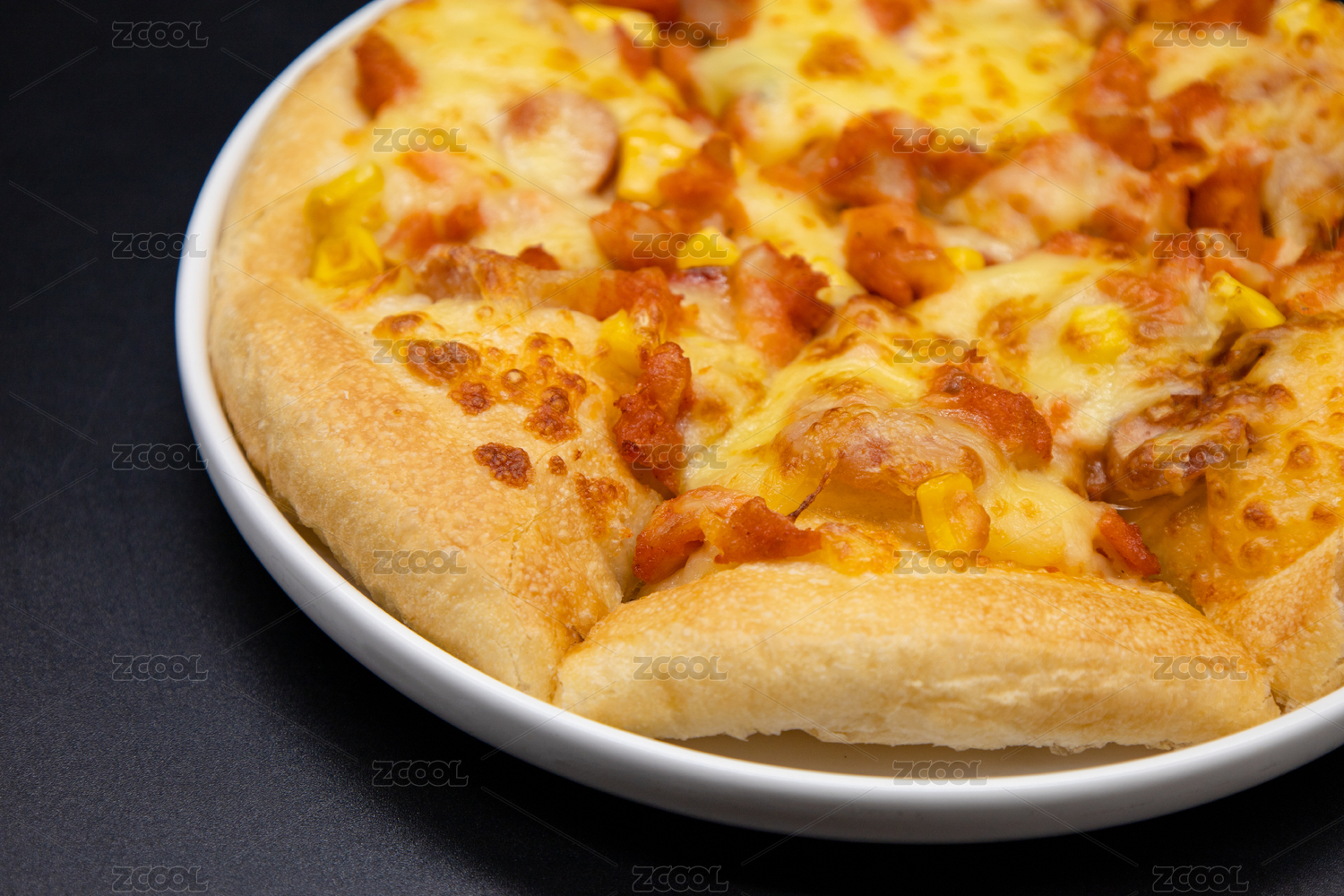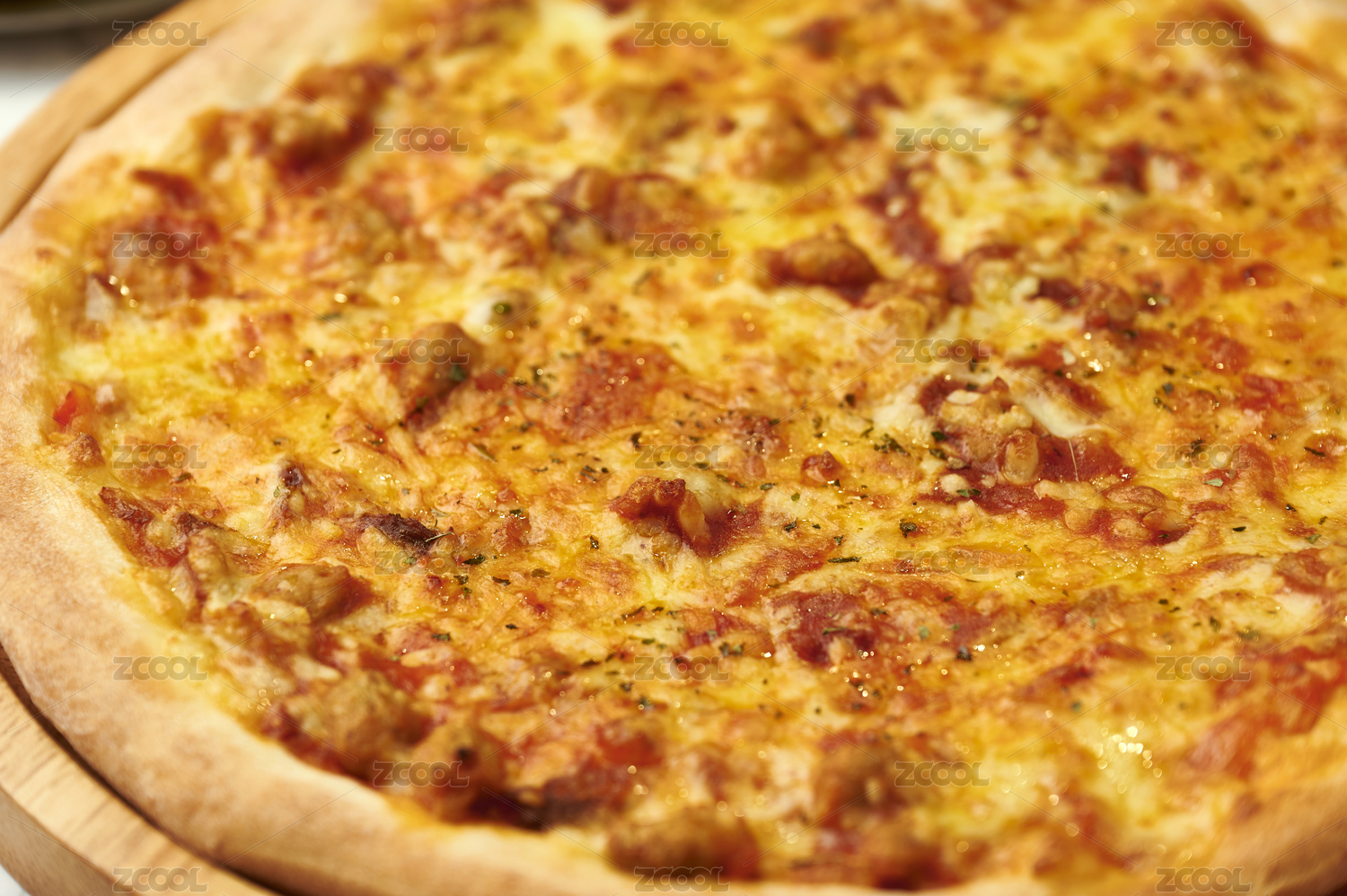 一份金黄诱人的奶酪拉丝鸡肉披萨特写