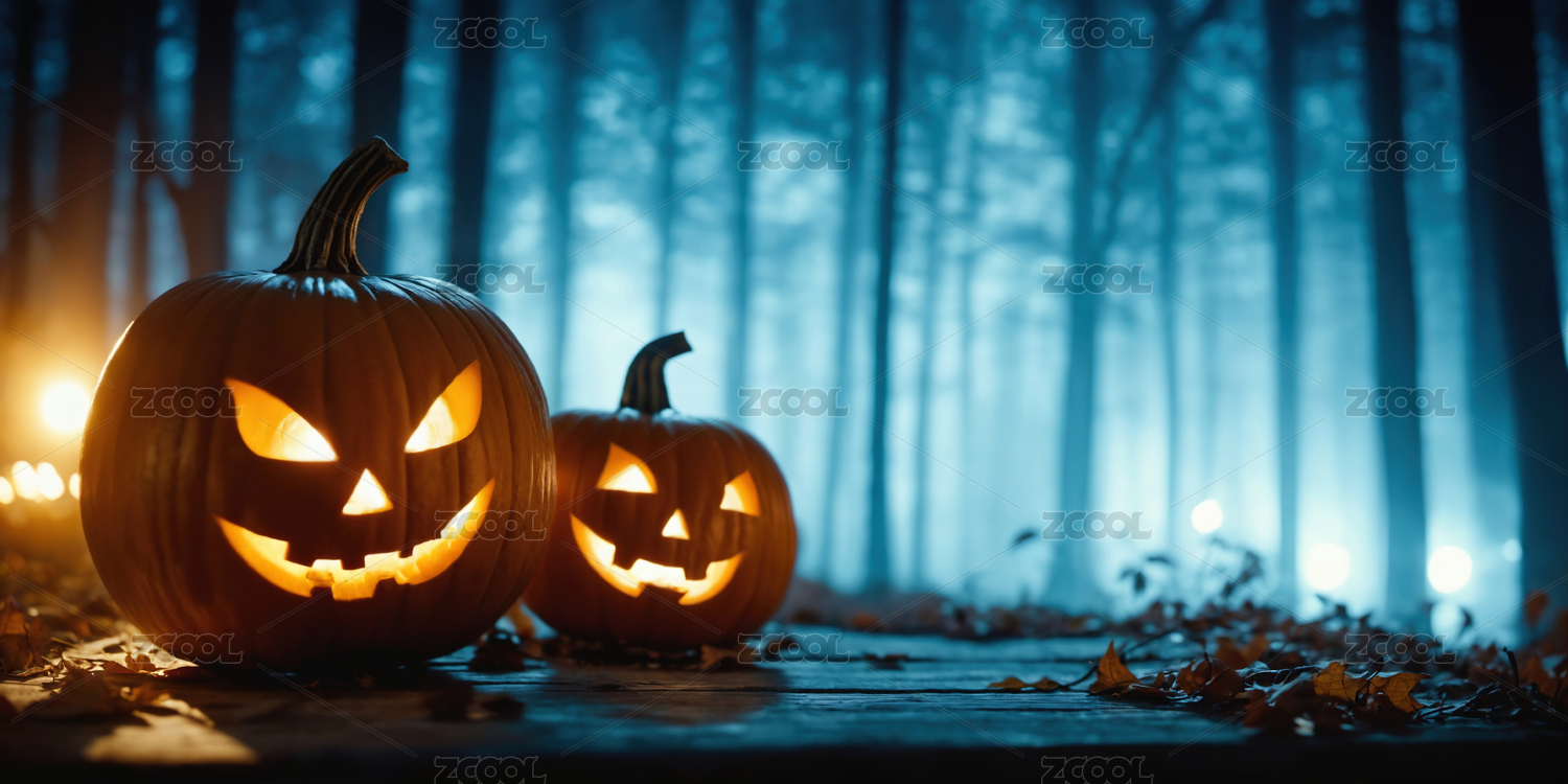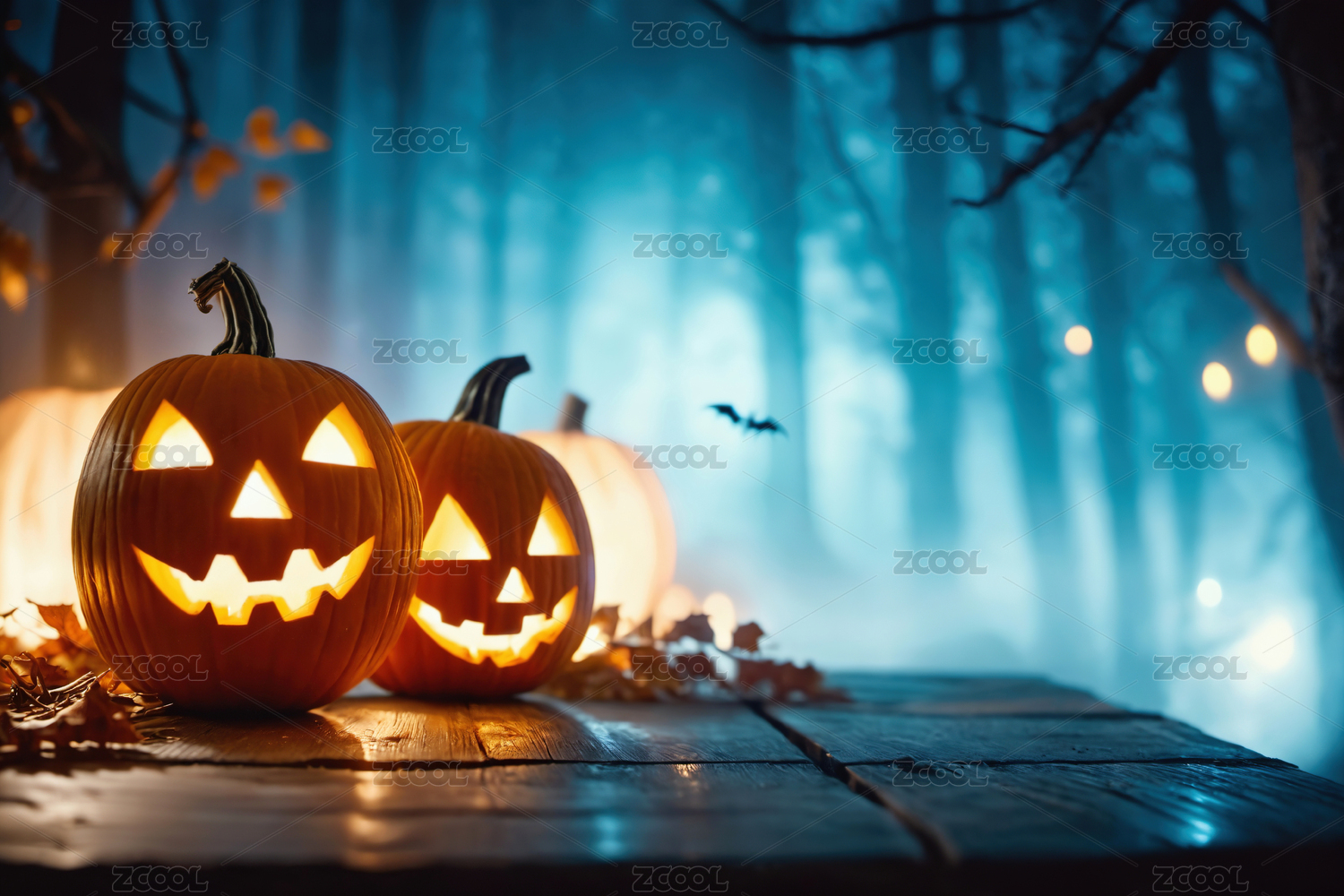 南瓜,灯光,夜晚,森林,木桌,鬼脸,神秘,恐怖,节日,庆祝