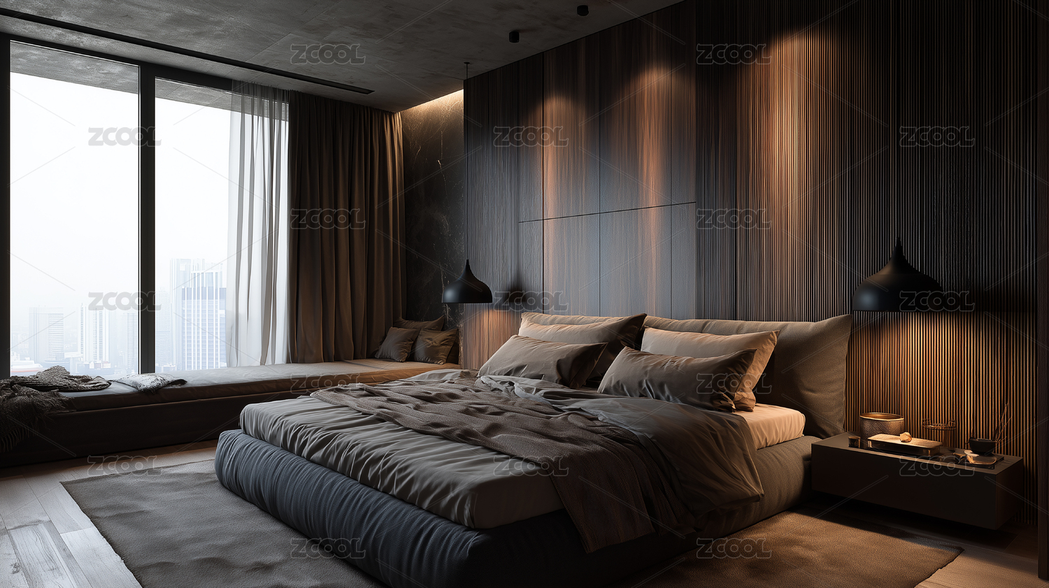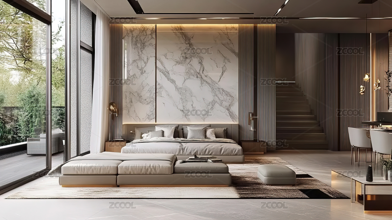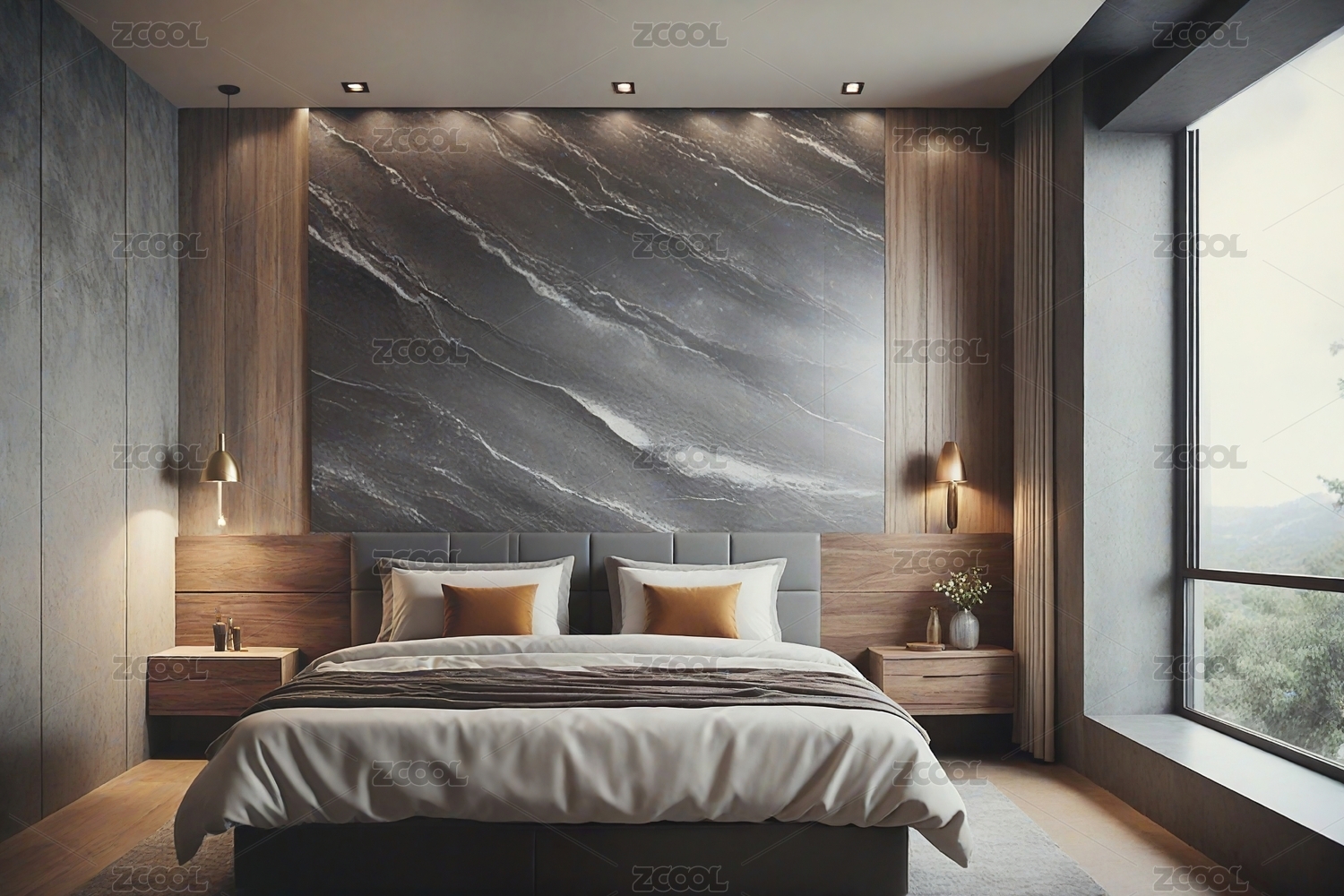 卧室,设计,现代,简约,床,床头柜,吊灯,墙面,大理石,木材