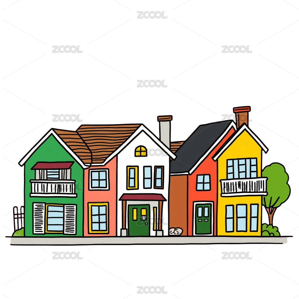 色彩缤纷的房屋排列,树木和云朵