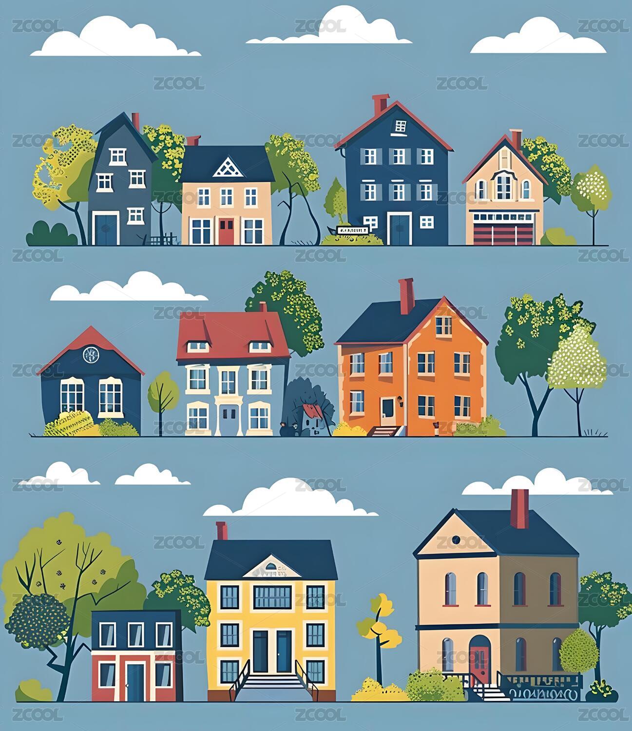 色彩鲜艳的房屋城镇插画