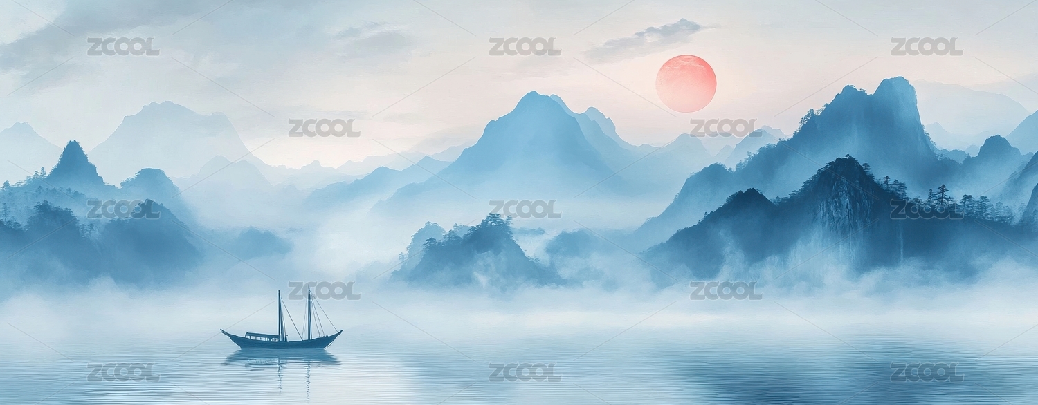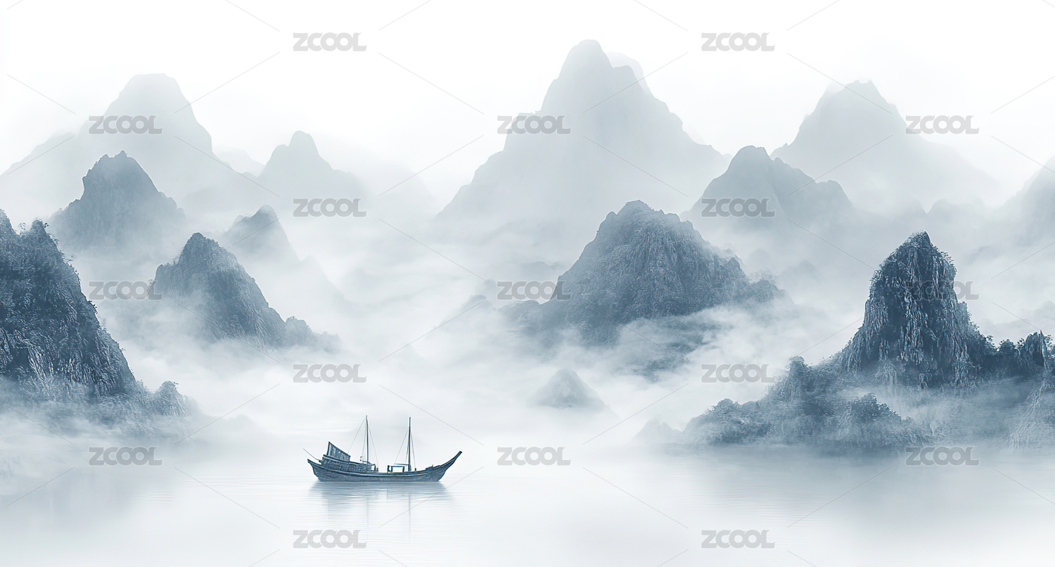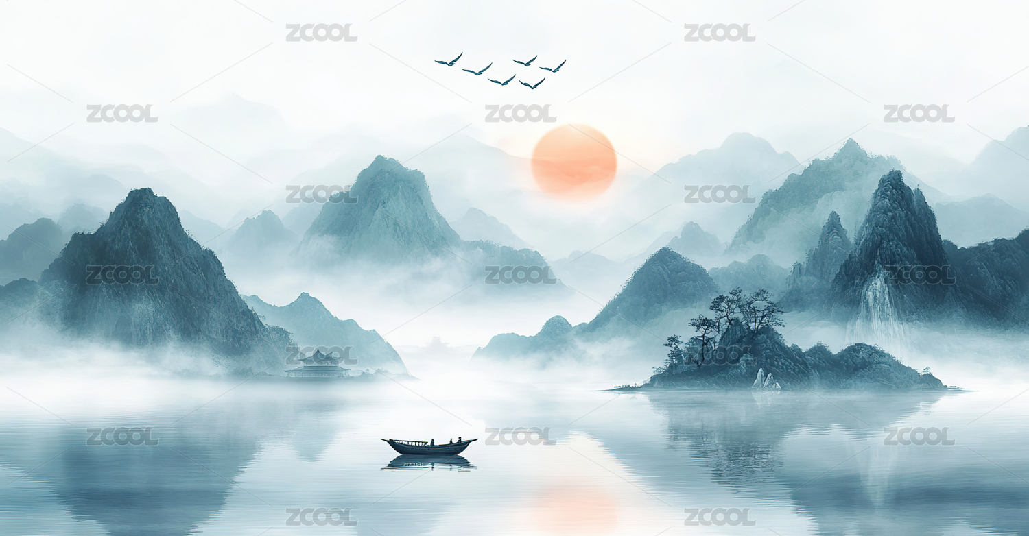 高山,中国画,中国文化,自然,国风,雾,插画,反射,水墨画