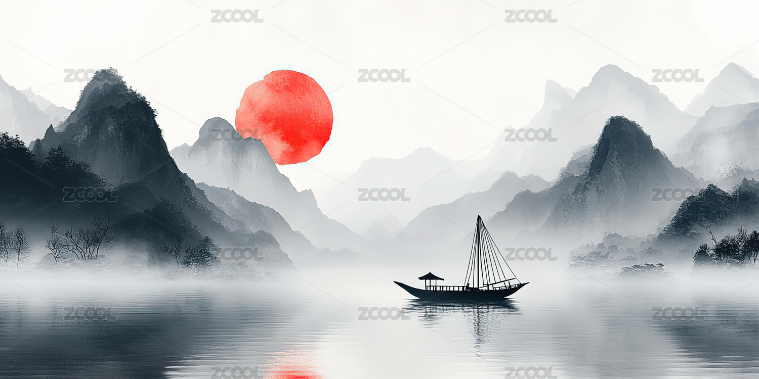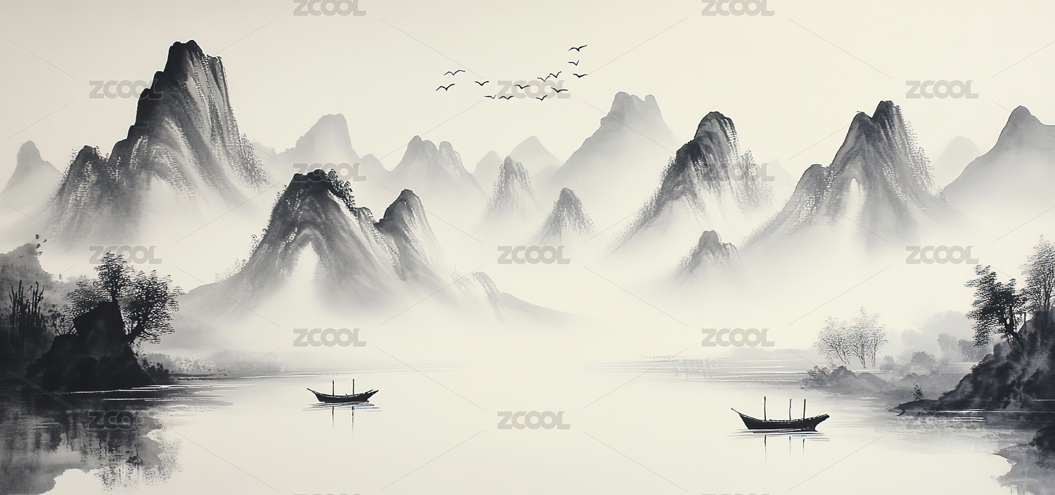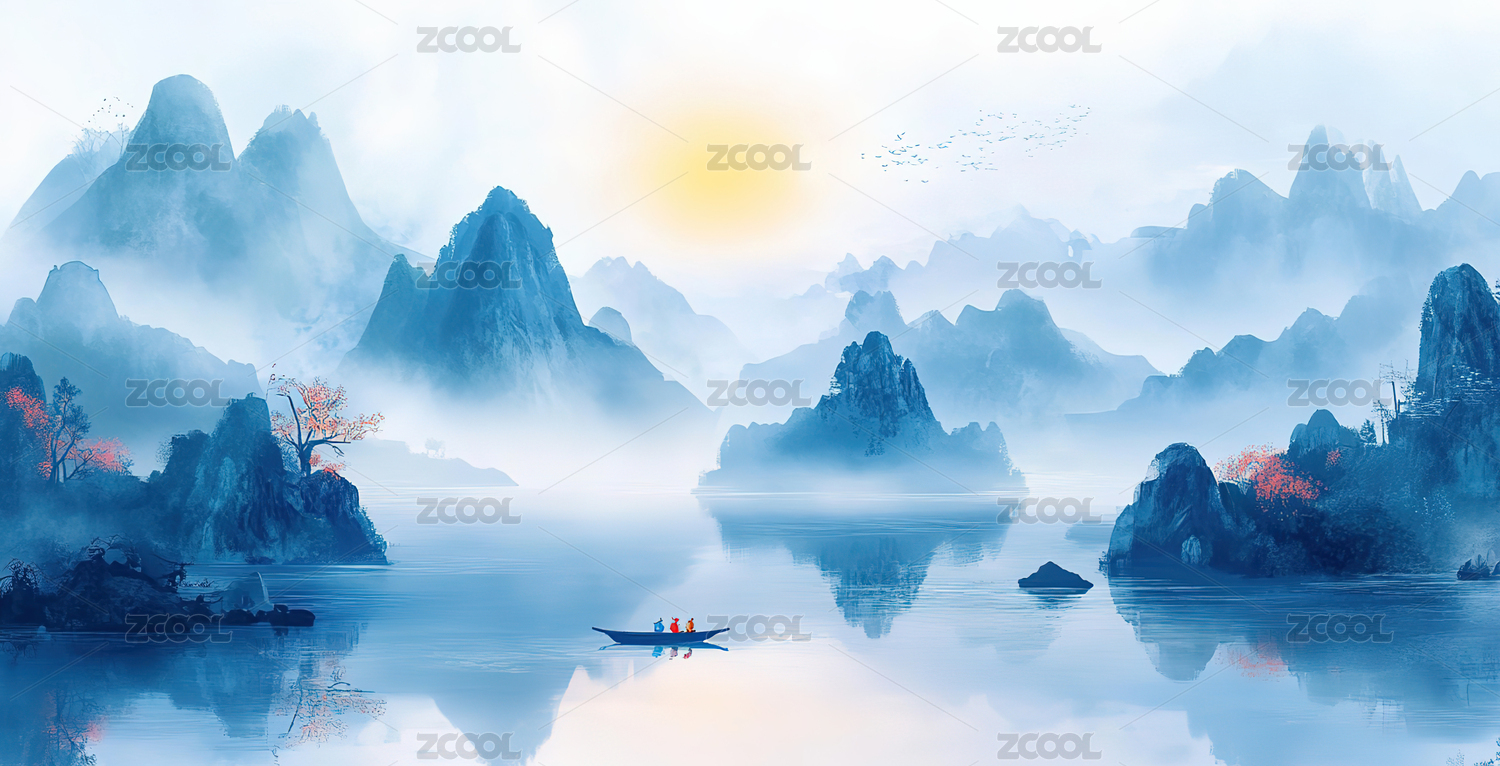 高山,中国画,中国文化,自然,国风,雾,插画,反射,水墨画