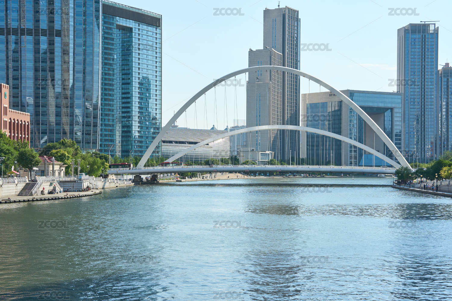中国天津海河的水路交通和现代建筑及桥梁天际线