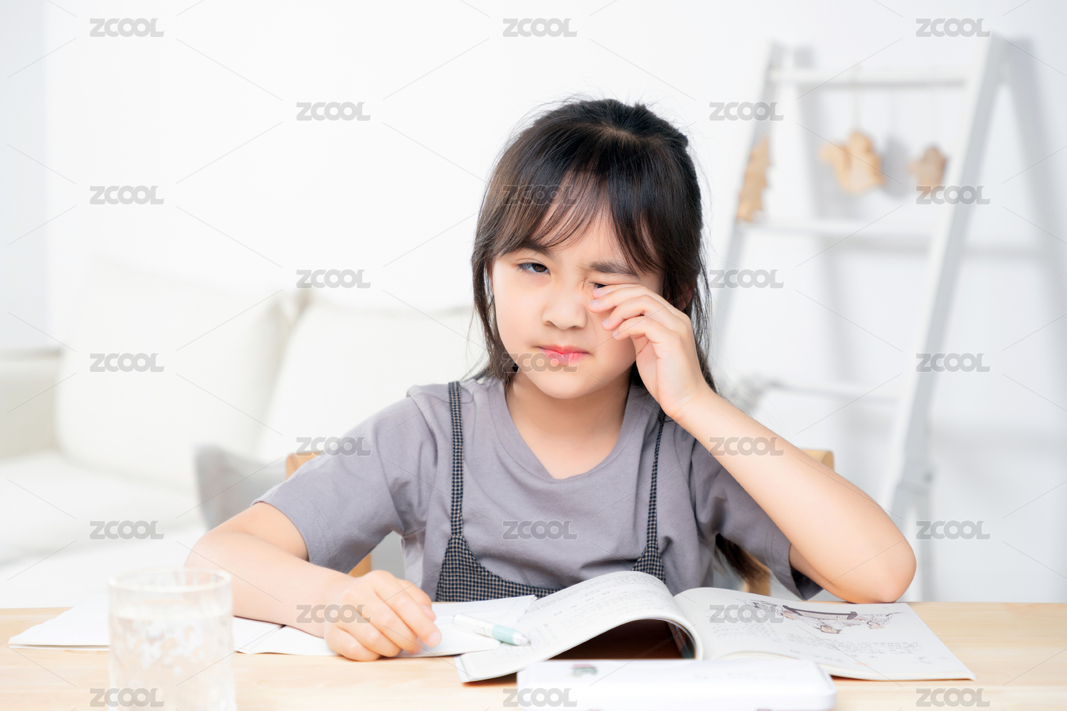 室内学习桌前写作业的中国小女孩