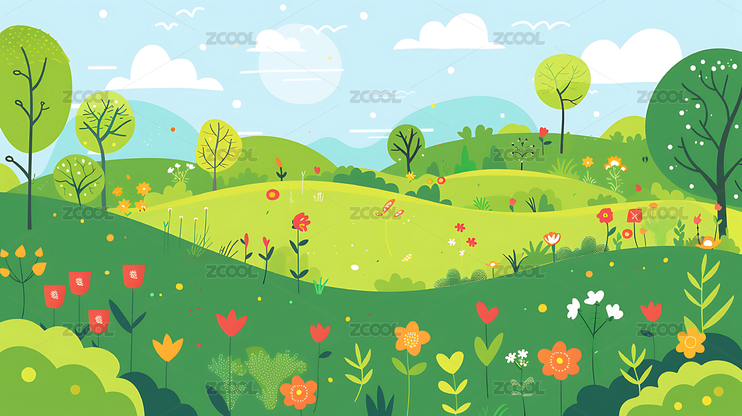 美丽的春天户外风景卡通插画