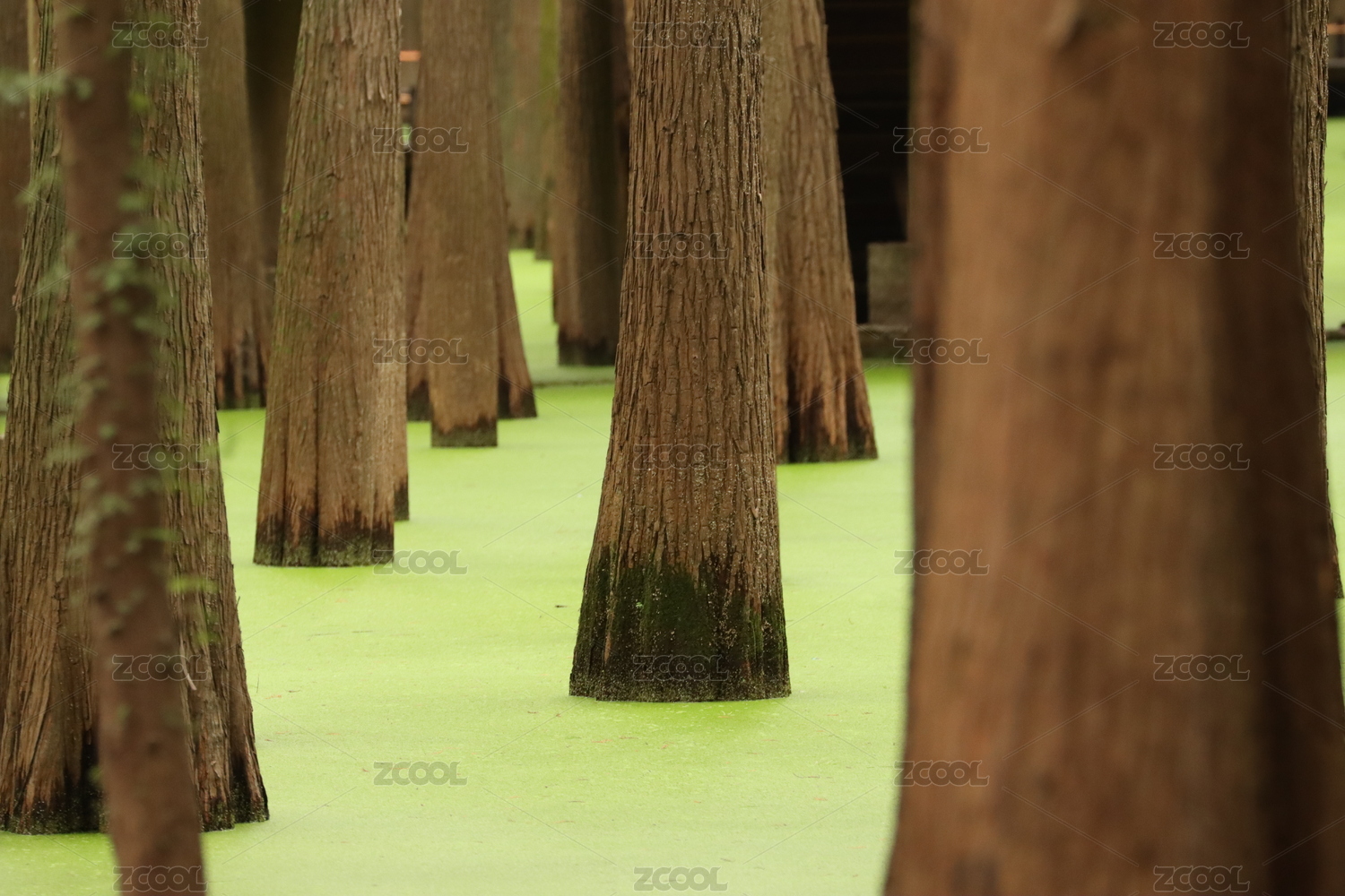 水杉森林的绿藻和树干